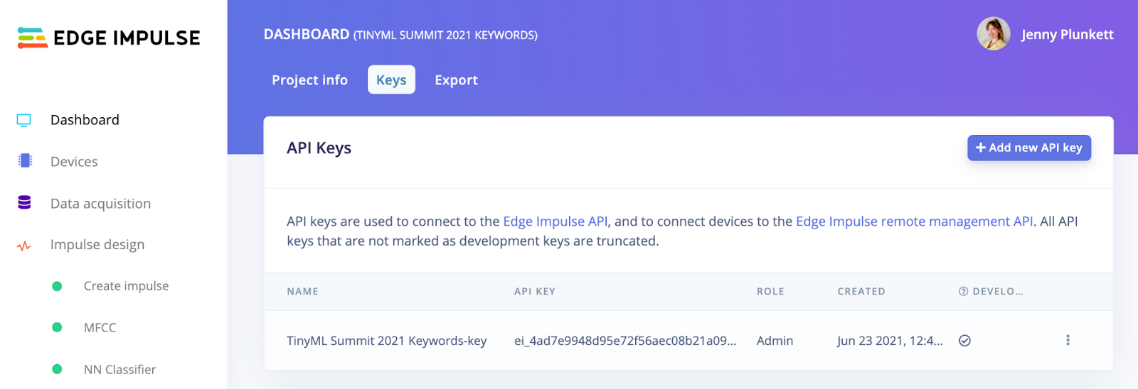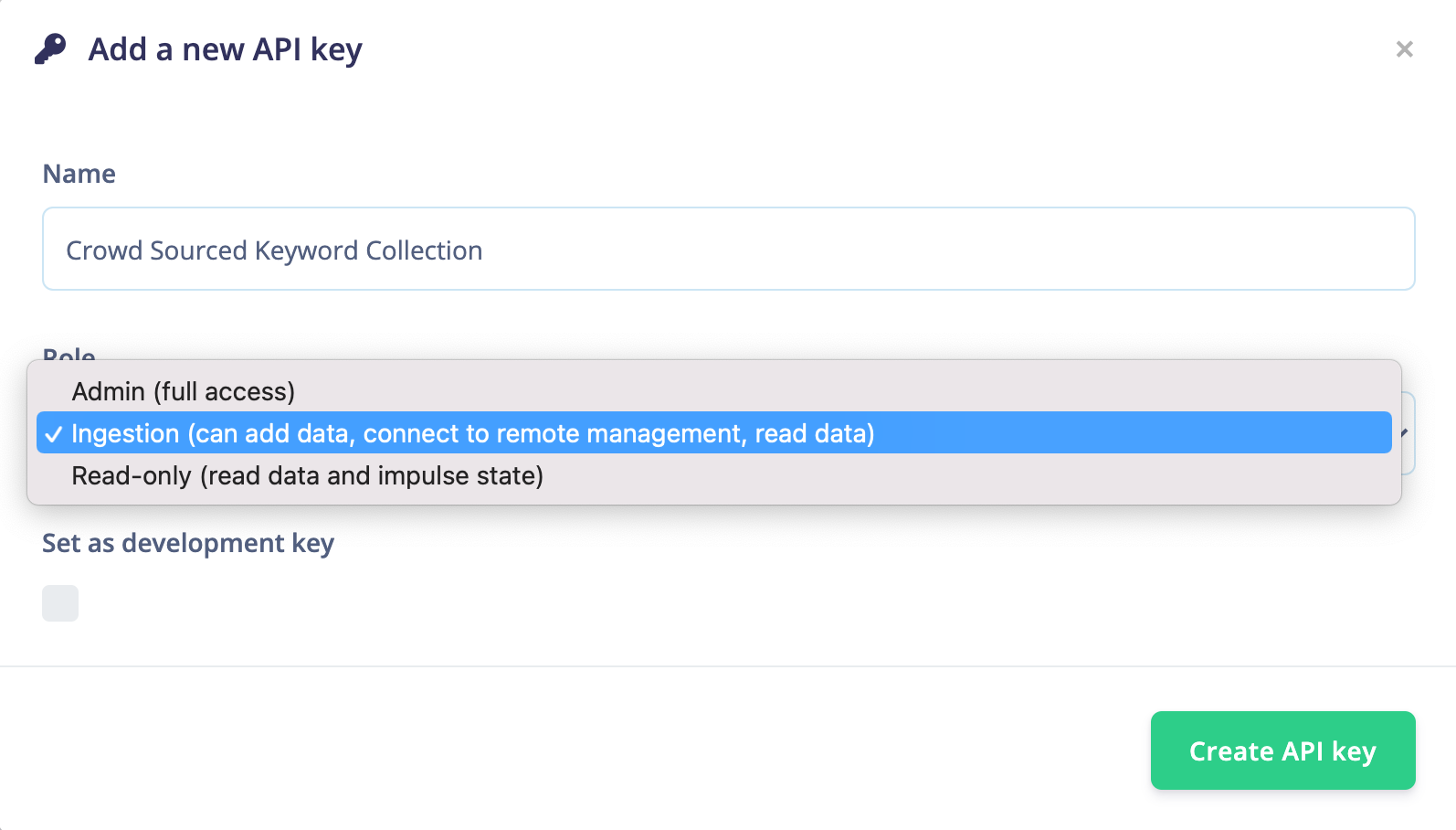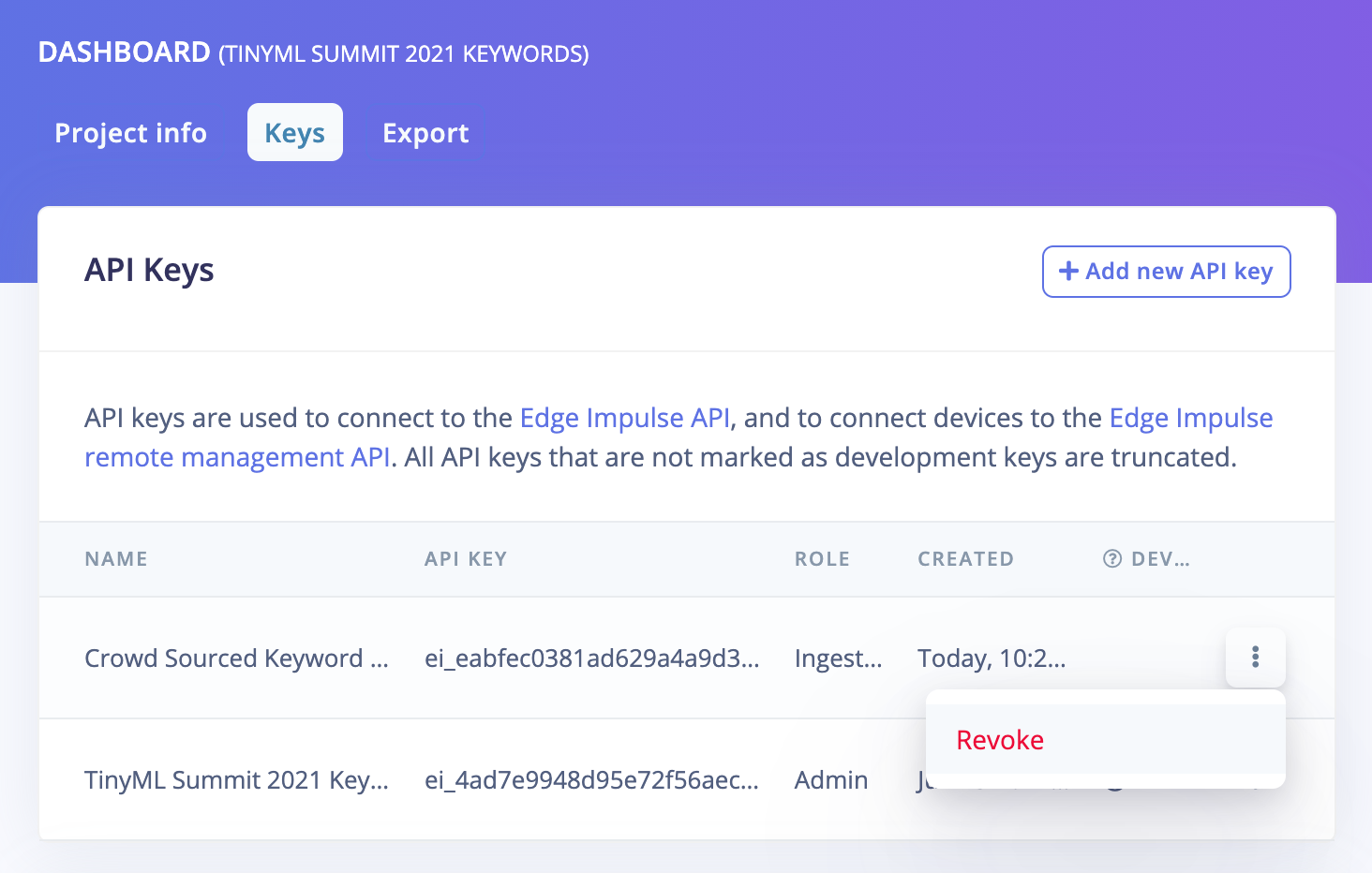 Then, create and copy a new Edge Impulse “Ingestion” API key for your project, which you’ll find under Dashboard > Keys > Add new API key > Role: Ingestion.