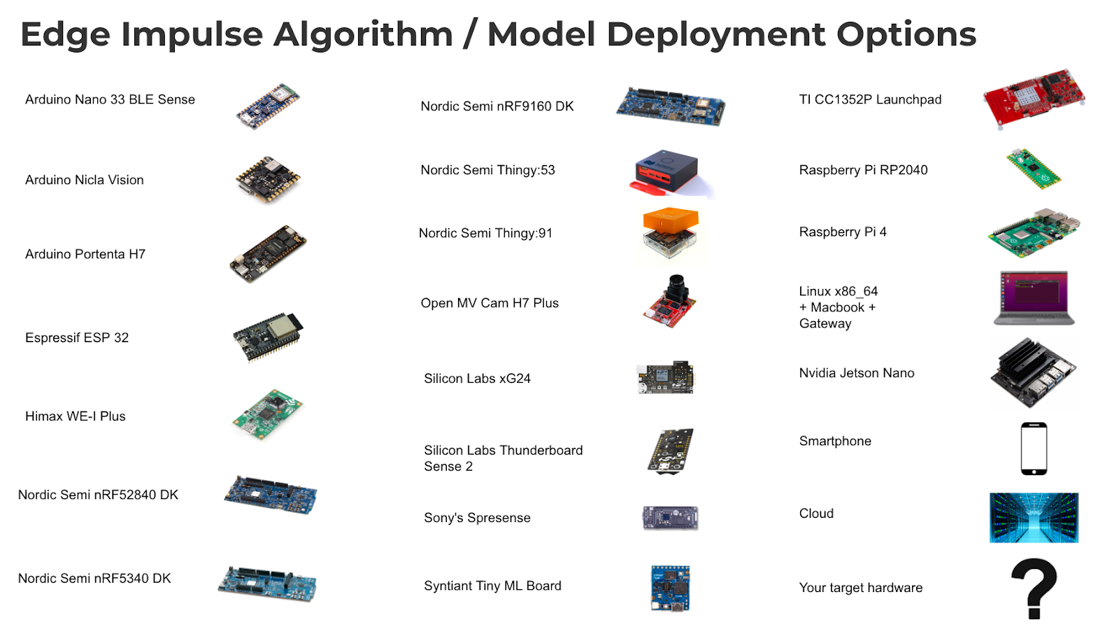 As new AI accelerated hardware releases into the market, from companies like Silicon Labs, Alif Semiconductor and Syntiant, wearables and devices manufacturers hardware teams may choose to design in these processors. Edge Impulse has the most robust ecosystem of hardware partners — both general purpose and neural accelerated processors that range from low-power MCUs to more robust processors with higher compute available.