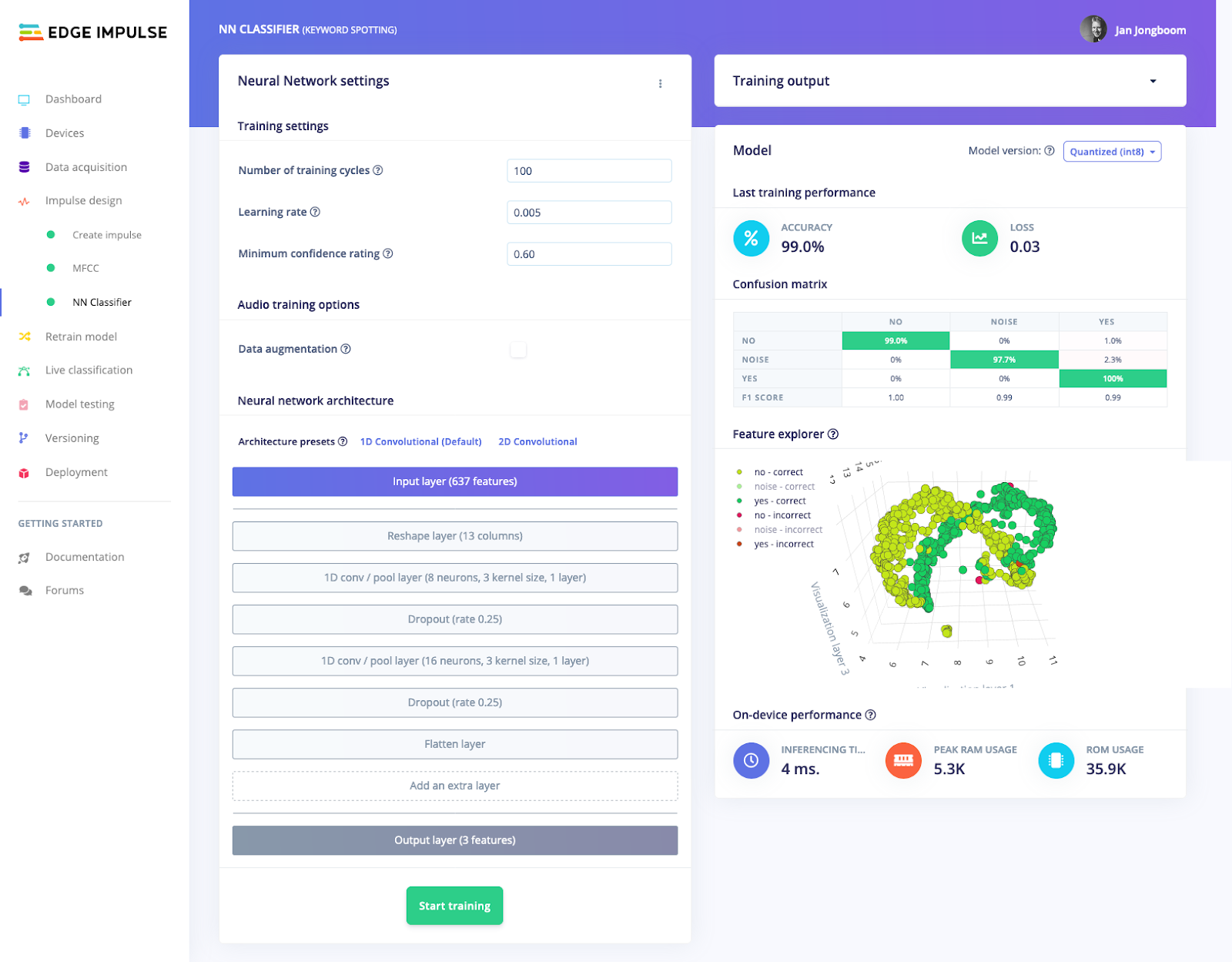 Currently the feature explorer shows the performance of your training set, but over the next weeks we’ll also integrate the feature explorer and the new confusion matrix to the Model testing page in Edge Impulse. This will give you direct insight in the performance of your test set in the same way, so keep an eye out for that!