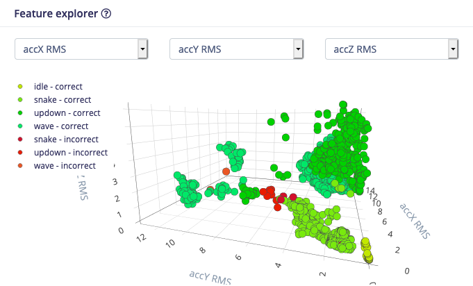 When analyzing whether a machine learning model works well, we rely on accuracy numbers, F1 scores and confusion matrices - but they don’t give any insight into why a machine learning model misclassifies data. Is it because data looks very similar, is it because data is mislabeled, or is it because preprocessing parameters are chosen incorrectly? To answer these questions we have now added the feature explorer to all neural network blocks in Edge Impulse. The feature explorer shows your complete dataset in one 3D graph, and shows you whether data was classified correct or incorrect.
