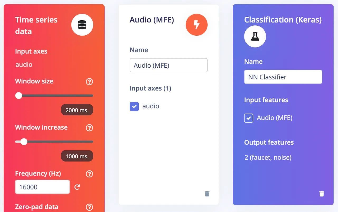 Having finished up the prerequisites, the stage was set to build the machine learning model. An audio MFE preprocessing block was first added to extract time and frequency features from the signal. By extracting the most important features from the data up front, any step in the pipeline that follows it will benefit from having less computationally-intensive work to do. These features were fed into a neural network classifier that interprets the incoming signal and learns whether it represents running water or normal background noise.