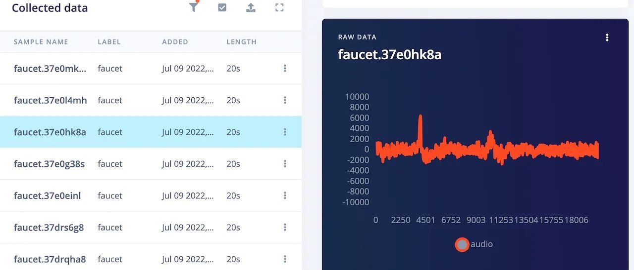 Before constructing the intelligent algorithm, sample data was needed to train it. Kumar used the Edge Impulse CLI to link the Arduino to his Edge Impulse Studio account, then recorded audio data with the onboard microphone. In total, he recorded fifteen minutes of audio data from two different classes — the faucet running and background sounds. This data was automatically assigned labels and uploaded to Edge Impulse. Before attempting a widespread deployment of a running water detector, a larger, more diverse dataset would need to be collected, however this small dataset should be just fine for a proof of concept.