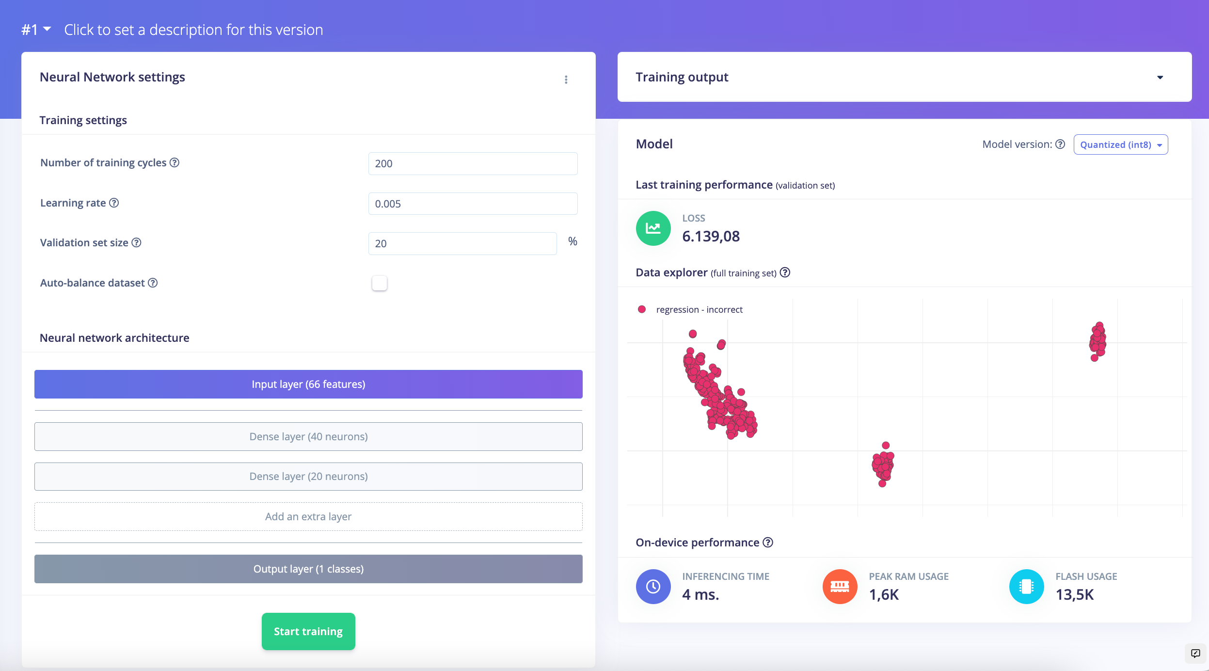 After uploading the training data, Salerno pivoted to the design of the impulse. A relatively large window of three seconds was chosen for splitting the data up to be sure that there was enough information for the model to learn from. A spectral analysis was conducted on the data from each window to highlight the most relevant features in the motion data, and to reduce the computational resources that would be needed later in the analysis pipeline. Finally, regression was chosen for the learning block because the project requires that continuous weight values be predicted. It was recommended that an iterative approach be used to choose the best model design — start with a small, two-layer network and see how it performs. If greater accuracy is needed, increase the size of the network. Starting small ensures that you will have the best performance possible after deploying the model to the physical hardware.