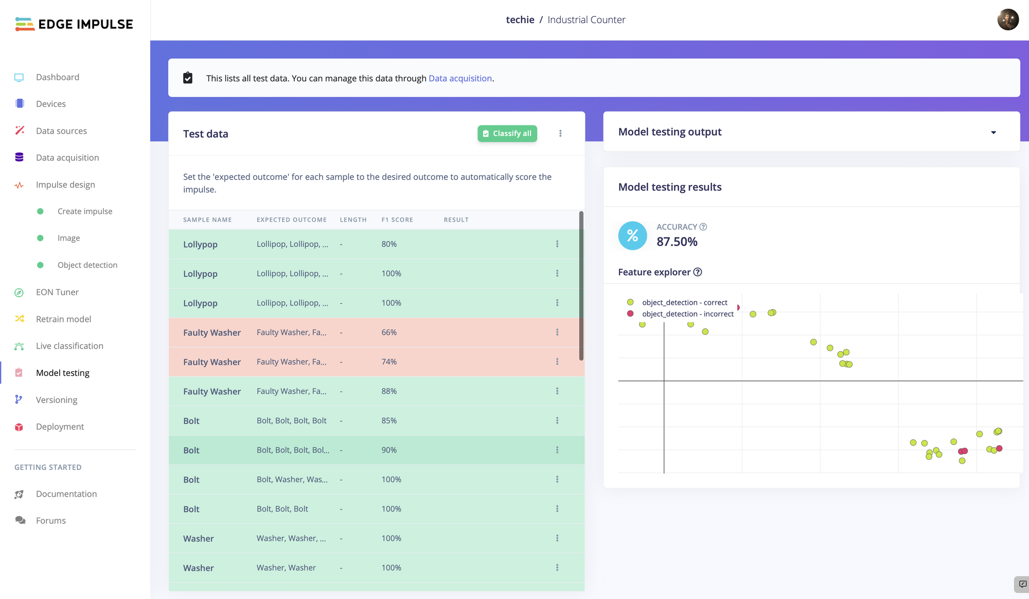 To test out the idea, Ravi collected a dataset consisting of images of washers, faulty washers, bolts, and lollipops. These images were uploaded to Edge Impulse, then labeled using the labeling queue tool. Labels were assigned by dragging bounding boxes around each object within the web interface — but since this tool uses a YOLOv5 model to estimate the bounding box locations, it will do most of the work for you. Simply verify that the boxes look correct, and click to move to the next example.