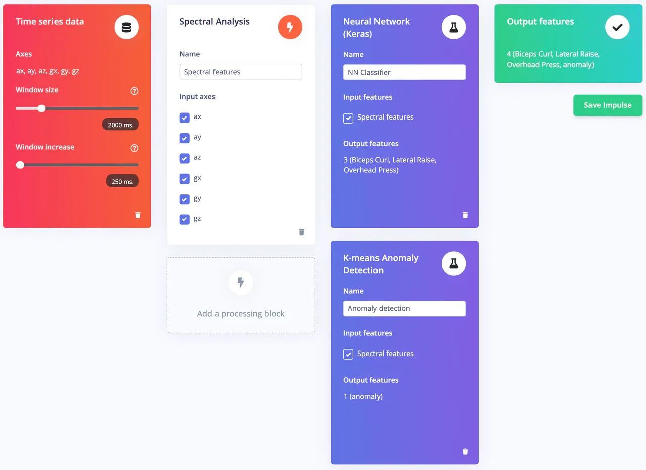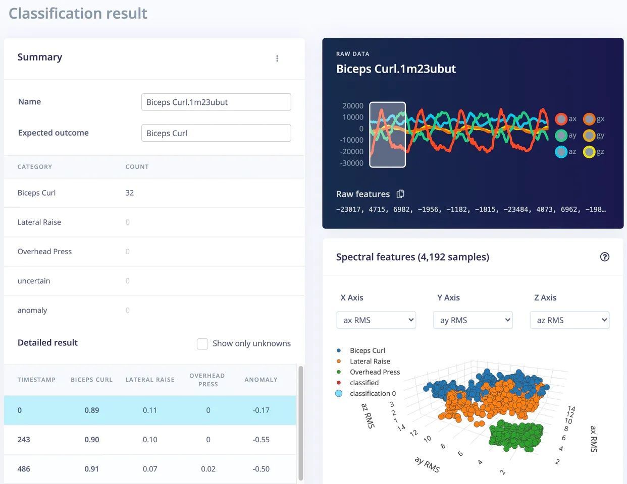 After all preprocessing, two learning blocks were employed — a neural network and a K-means anomaly detector. The neural network was used to classify IMU data into one of the three recognizable exercises, along with a measure of the model’s confidence in that prediction. The anomaly detector recognizes when an exercise is performed in an unusual way, which can indicate that bad form is being used, or that the motion is being performed too fast. This allows for real-time feedback during your workout, blurring the line between fitness tracker and personal trainer.