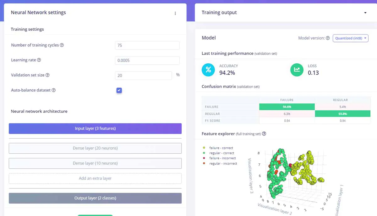 An impulse was created with a machine learning classifier, and it was trained on the data that was previously uploaded. Training classification accuracy was found to reach 94.2% by the end of the process. The feature explorer tool showed good separation between the classes, indicating that the selected variables have good predictive power. A good model having been developed, Bandini next needed to deploy the model to the Arduino board.