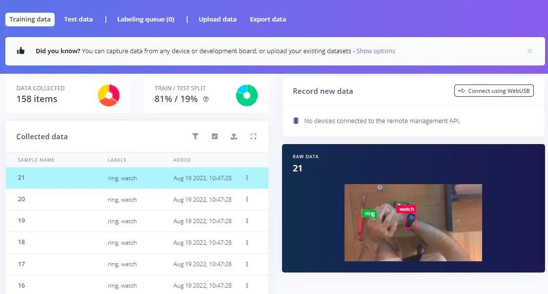 To identify items like jewelry and ESD wrist straps in images, Lutz chose to use Edge Impulse’s powerful FOMO object detection algorithm. FOMO makes it possible to run what is traditionally a very computationally intensive algorithm type on resource-constrained edge devices at upwards of 60 frames per second. As a prerequisite, training samples needed to be collected to teach the model how to recognize objects of interest. So, Lutz started collecting videos from his electronics workbench where he demonstrated both good and bad ESD safety practices.