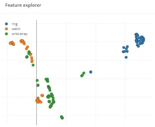 Having squared away the training data, everything was in place to create the impulse that processes the data. Images were first preprocessed to reduce their resolution and convert them to grayscale, which reduces the computational resources needed by subsequent steps in the impulse. The processed images were then forwarded into a FOMO object detection algorithm that can recognize four object types (ring, watch, wrist strap, and background). Recognizing more object types for future versions of the device would be as simple as collecting and labeling more training data.
