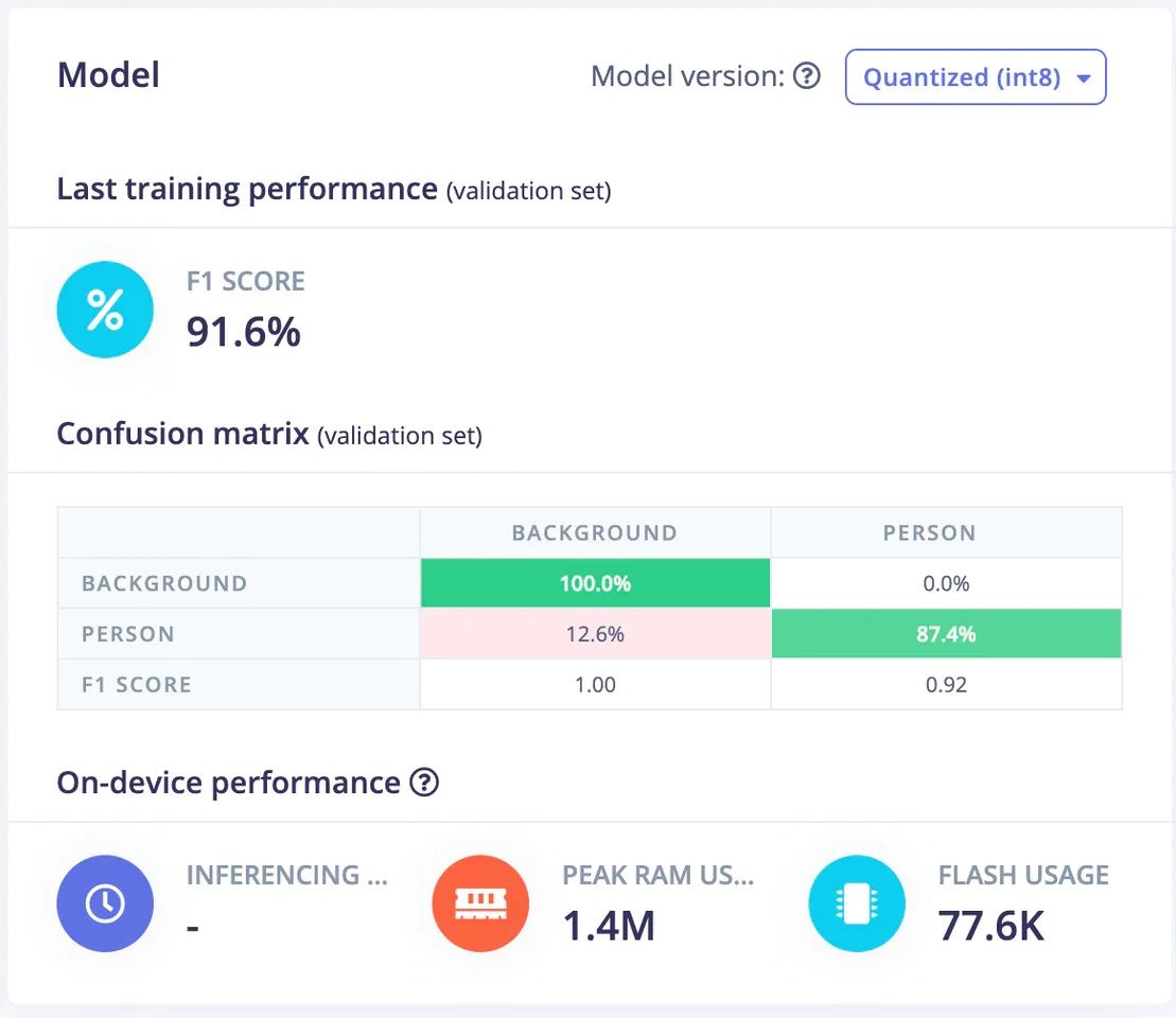 An impulse was created to preprocess images and reduce the downstream computational complexity associated with their analysis. This processed image data was then fed into a FOMO object detection model and trained on the previously uploaded labeled dataset of images from the PIROPO database. The F1 score of the training process was found to reach 91.6%, and a subsequent validation of the model showed that object recognition accuracy had reached 86.42%. The Arduino Portenta H7 and Vision Shield are fully supported by Edge Impulse, so the deployment process can generate firmware that natively runs on the board. Simply flashing the board with this firmware installs the full machine learning pipeline.