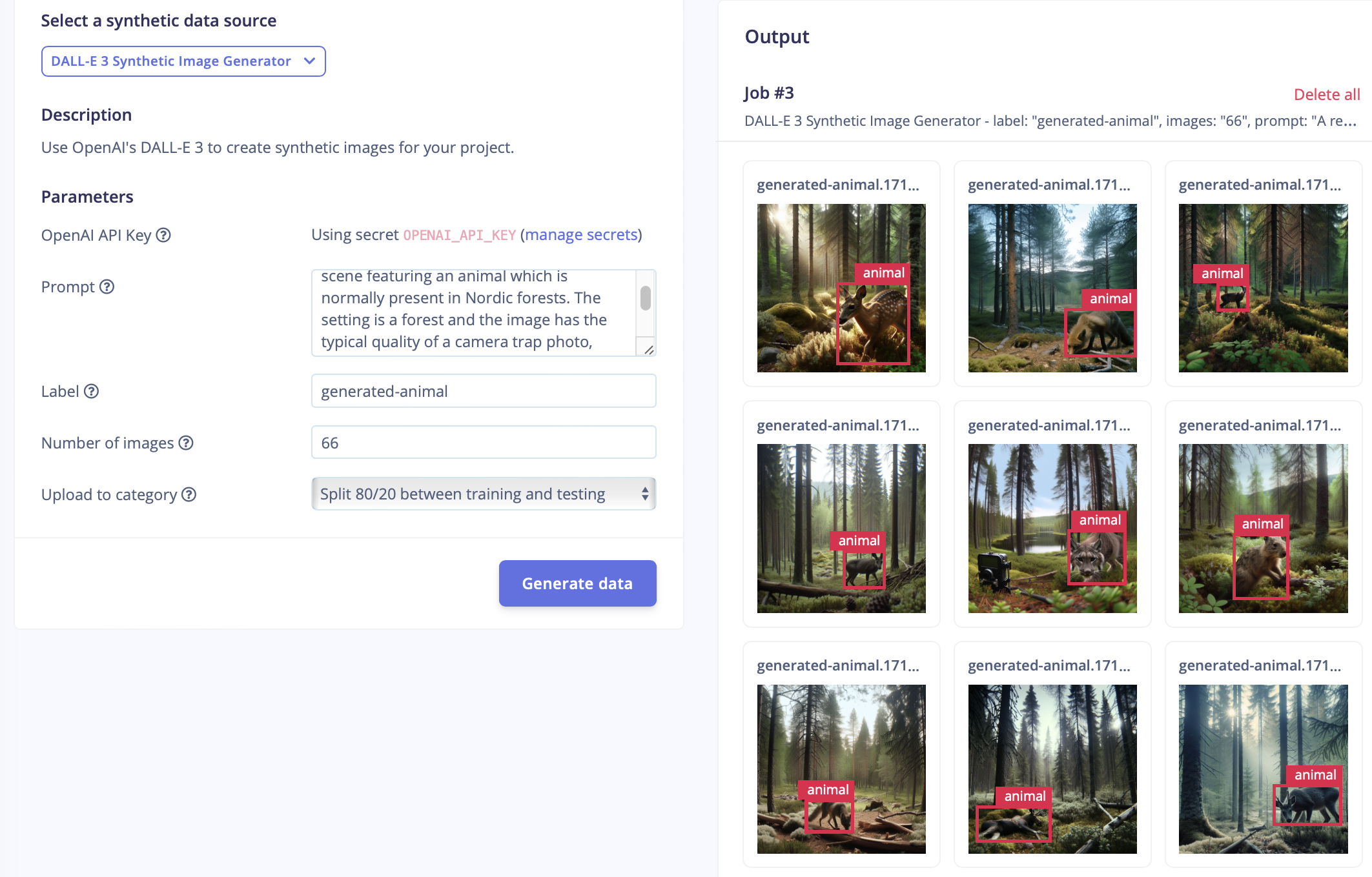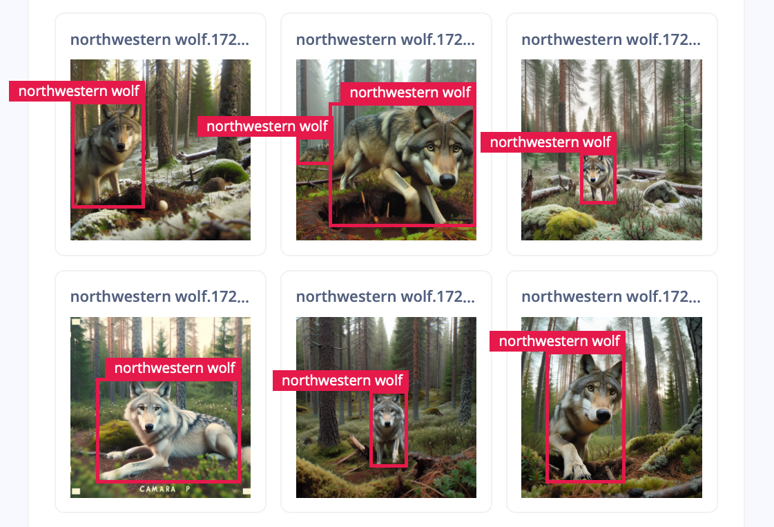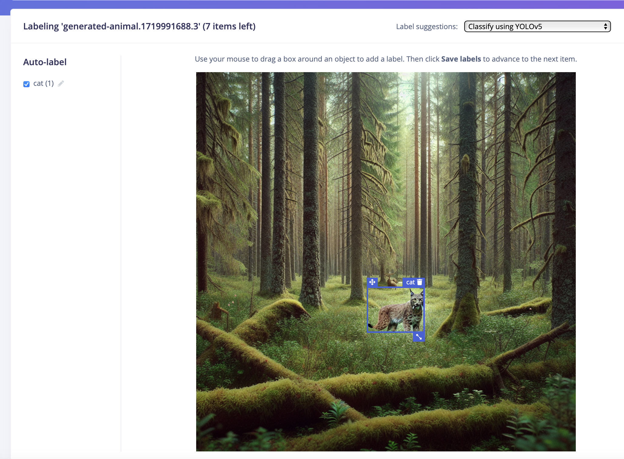 The generated synthetic images are initially unlabeled. Also here I made use of a larger model, but labeled them quickly using the "label with YOLOv5" option in the labeling queue. I accepted the suggested labels, such as "cat" for a lynx, and then relabeled all the labels at once as "animal".