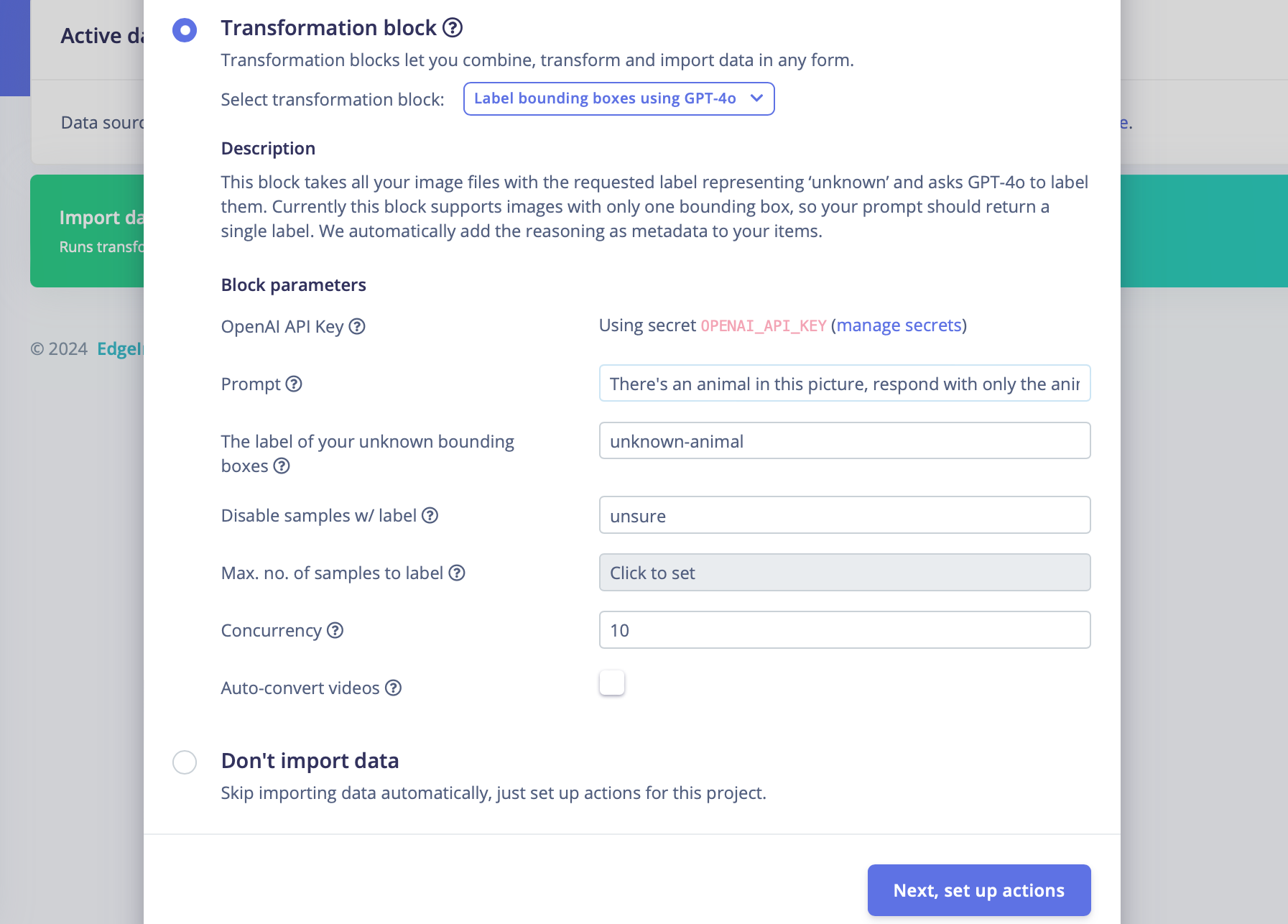 I then uploaded this data to a new project to develop a target model that can differentiate between species in this wildlife habitat. The bounding box labels were still all "animal," and manually relabeling them would be cumbersome. To address this, I created a custom transformation job. I was inspired by the public transformation job "Label image data using GPT-4o" to label images for image classification, but as my project is for object detection, I created a new variant to do the following: