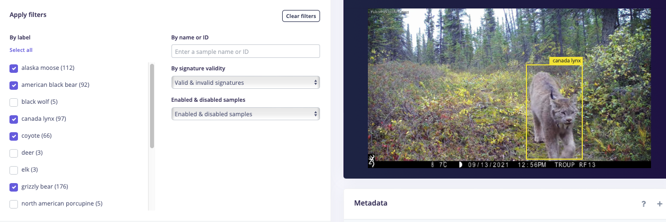 The result of this indeed sped up the labelling process; I just had to join a couple of classes that represented the same species but got different spellings, e.g. "Alaska moose" and "Alaskan moose," which was done with a quick batch relabelling. Apart from that, very few samples got the "unsure" label assigned and those were indeed tricky to classify, e.g. an animal exiting the frame. This process creates the knowledge of which classes to include in the final species model. For species with only a few samples, I disabled them until more data was available to maintain a balanced class ratio. Seven species were considered to have enough data: Alaska moose, American black bear, Canada lynx, Coyote, Grizzly bear, and Northwestern wolf.
