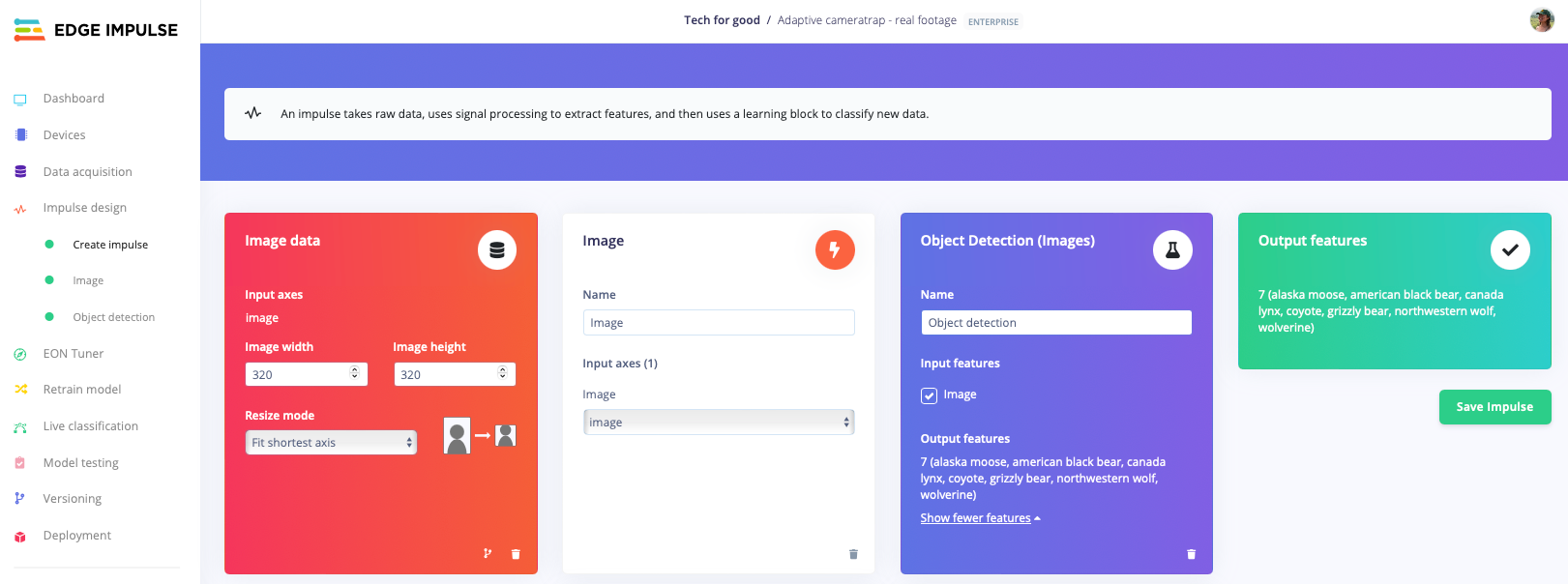 The next step was to deploy the model and expose it to a real-world environment. In this case, I envisioned my deployment site to be the Yukon Wildlife Preserve in Canada. For simulating this, I chose Docker deployment in Edge Impulse and ran it on my laptop, feeding it with snapshots from actual camera trap recordings from Yukon using a simple Python script. As a result of approximately 30 minutes of compiled interesting shots, I obtained 520 images with detected animals, which I saved as raw images along with the bounding boxes in YOLO TXT format (this is one of several formats supported in Edge Impulse).