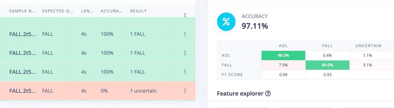 At this point, Kumar was ready to build the rest of the impulse to analyze and classify his device’s accelerometer data. He started with a spectral analysis preprocessing step, which is well suited to dealing with repetitive motion (as seen with accelerometers) and extracting the most relevant features from that data. Those features are then fed into a neural network classifier that distinguishes between normal activities and falls. After training the model, it was validated against a test dataset and found to have an excellent classification accuracy rate of 97.11%.