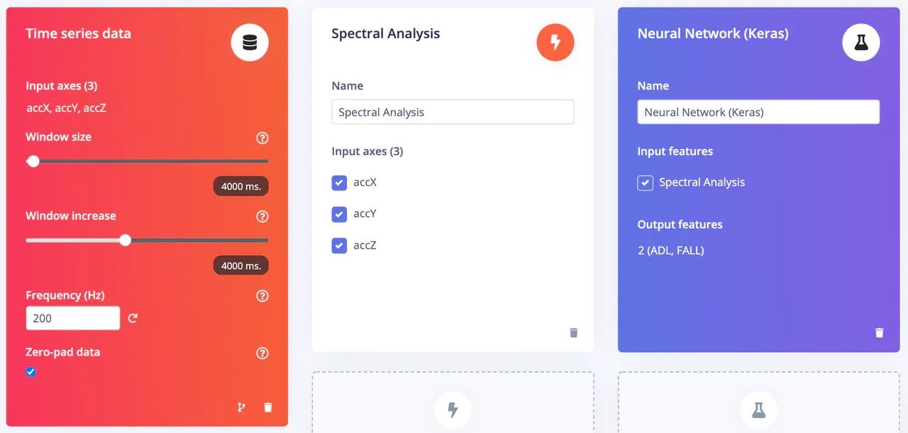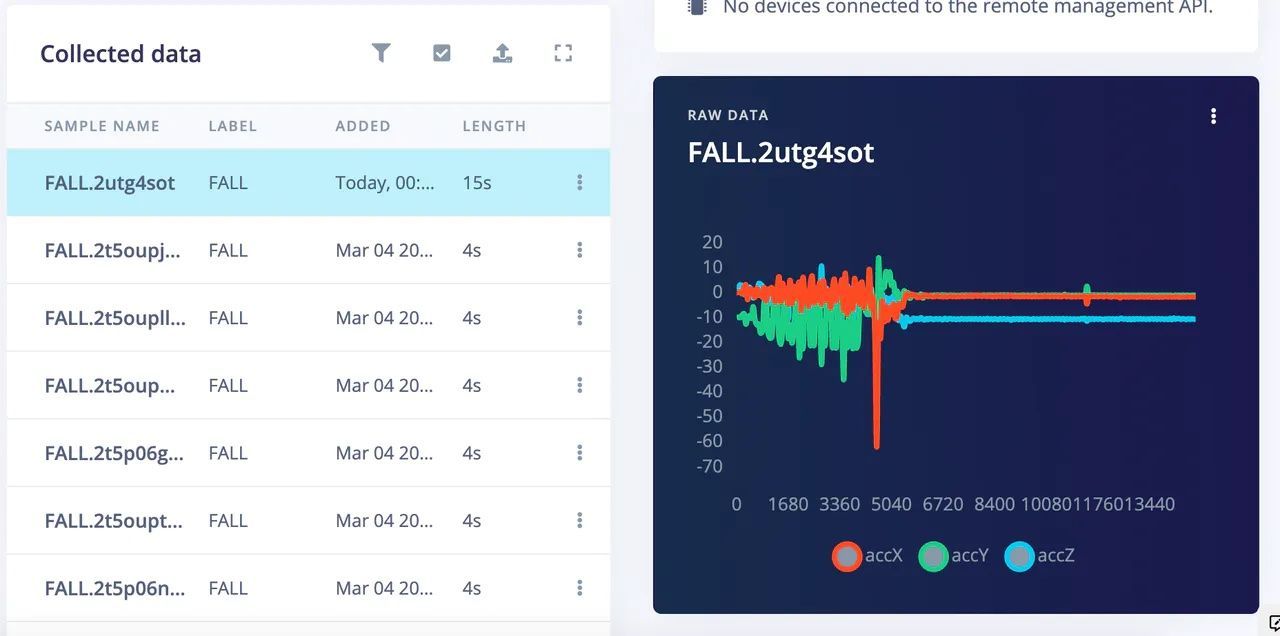 The first step in building a machine learning pipeline is collecting training data. Fortunately for Kumar, high-quality public datasets of accelerometer data from normal activities and falls already exist. This saved him the time (and pain) of building the dataset himself, and he was able to upload an existing dataset to Edge Impulse after some minor transformations of the data. The training examples were divided into “fall” and “activities of daily living” categories.