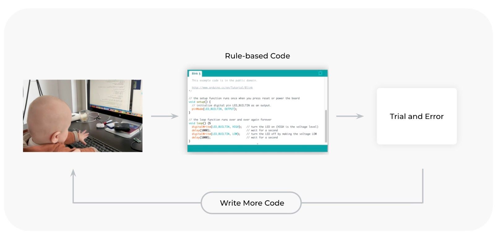 Nearly all products and systems involving computers today are built by humans writing code, mainly by trial and error. Below is Jan’s baby Sami, already an accomplished coder. :-) Developers solve problems today using code by interpreting what they assume the input data will be, then structuring coded rules to handle the data to produce some result. Through trial and error, we improve the program by writing more code. Rule based programming quickly fails when dealing with complex multi-dimensional data such as sensor data, audio, computer vision, network traffic and much more.