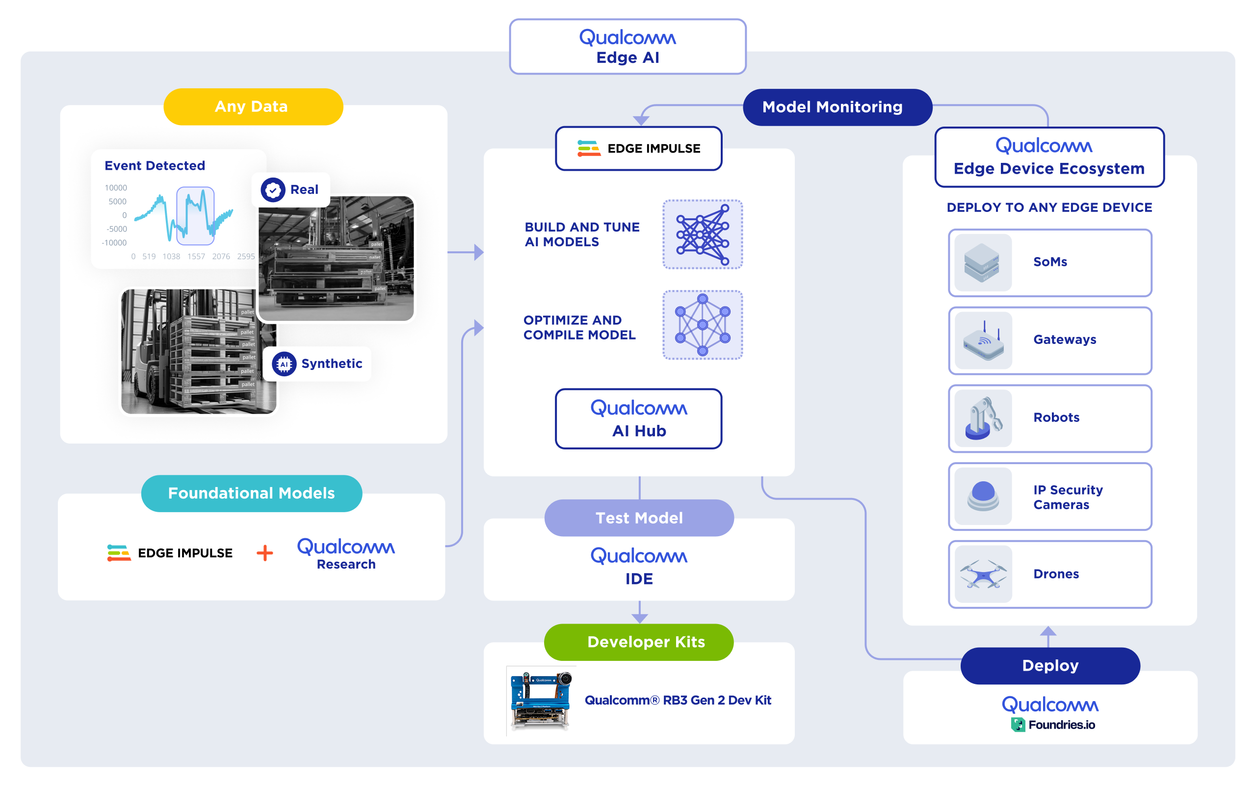 - Use Edge Impulse Studio to collect data, train, and fine-tune edge AI models and deploy models as C++ libraries, Docker containers, or an EIM binary for Linux with Qualcomm neural network accelerators to integrate your models in your application using your favorite programming language.