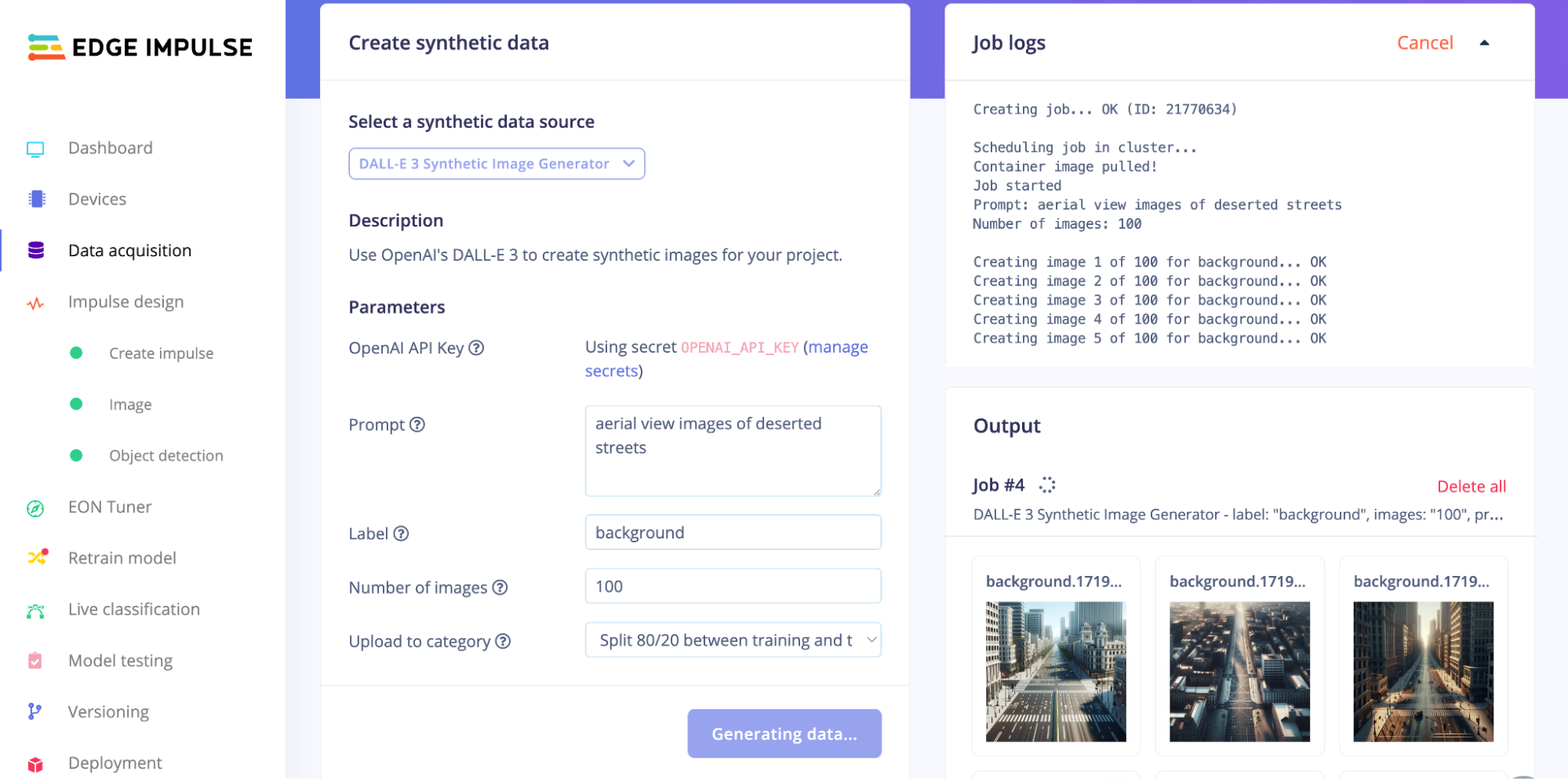 This iterative workflow will make it much clearer to determine the right prompts for generating data. Additionally, any data that is not deleted will automatically be added to the project, ensuring seamless data management as you continue to build and refine your edge AI model.