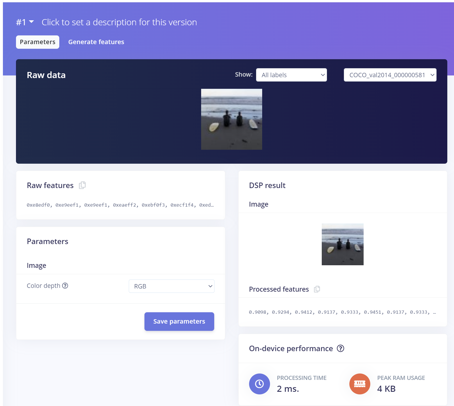 The image we process as 96x96 pixels with the resize mode of squash. On the image parameters we leave the color depth as RGB and generate the parameters.