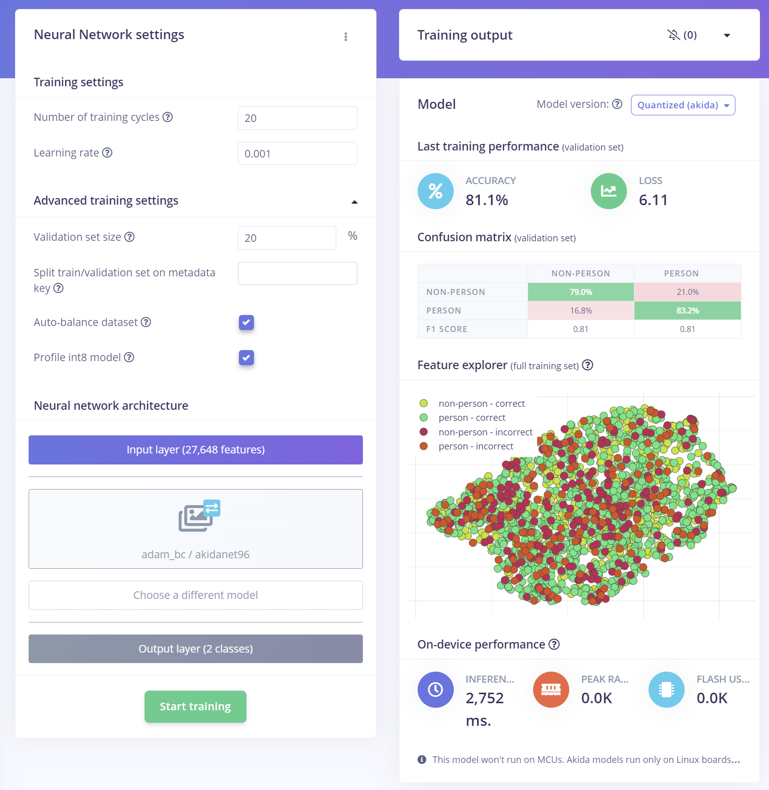 In this example, I set out to see if I could recreate the accuracy achieved for the BrainChip visual wake work detection using Edge Impulse. The original accuracy for the BrainChip VVW was 84.77% while Edge Impulse trained version was 83.2% which is very close to the original results and within what I would consider the margin of error.