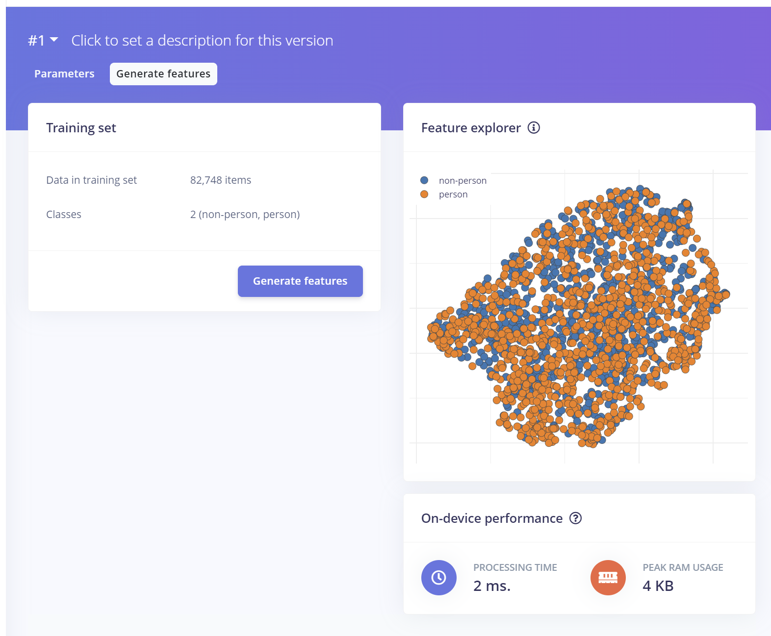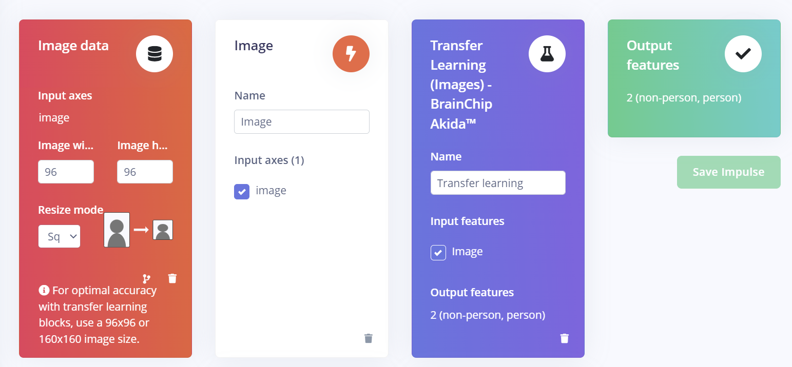 After the data has been uploaded, we can then start developing the impulse. We use the AkidaNet VWW Transfer Learning block for this.