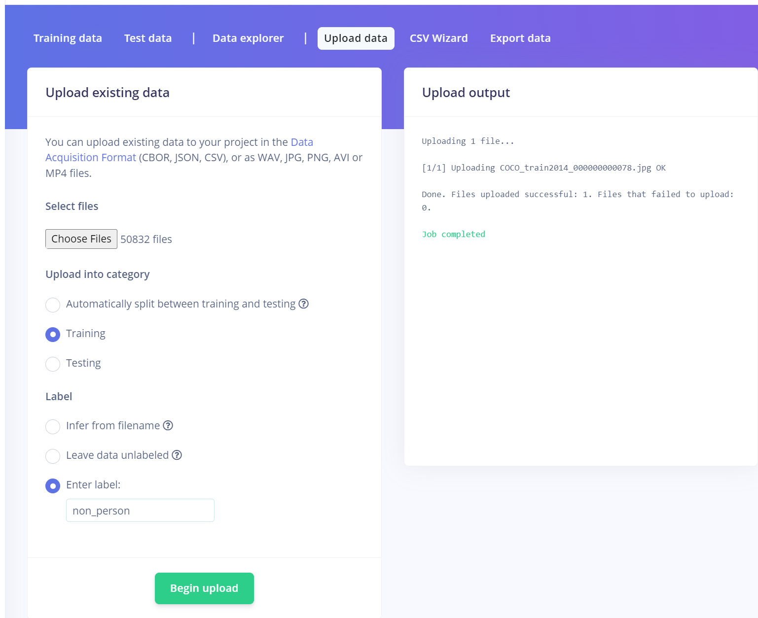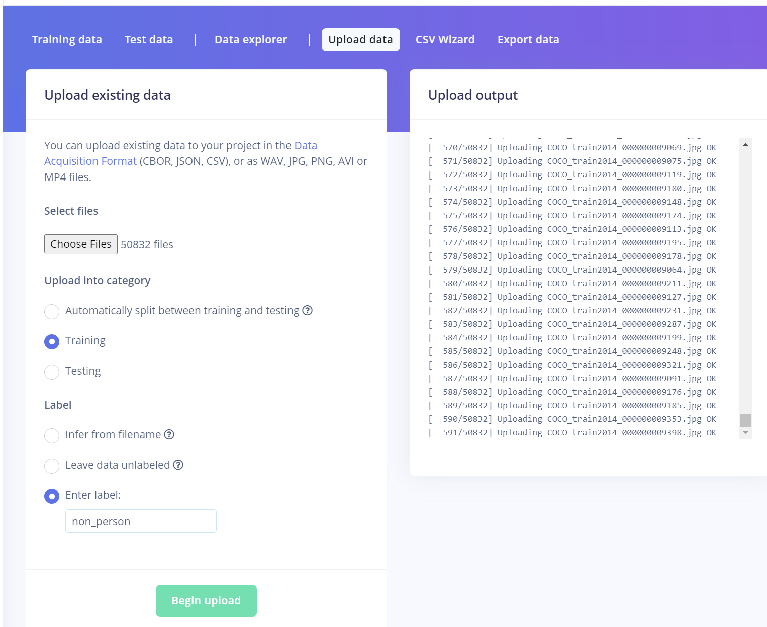 With the dataset downloaded we need to then upload them into our project in edge impulse. To do this, I used the data acquisition tab to upload all the training and testing data. Due to the large number of images, over 100,000 this may take a little time.