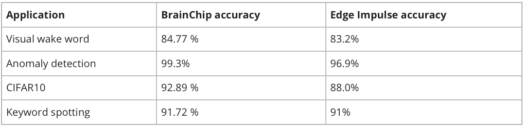 I have linked the projects at the end of the blog, however, you can see in the table below the alignment between what BrainChip achieved and what I was able to recreate with Edge Impulse relatively easily.