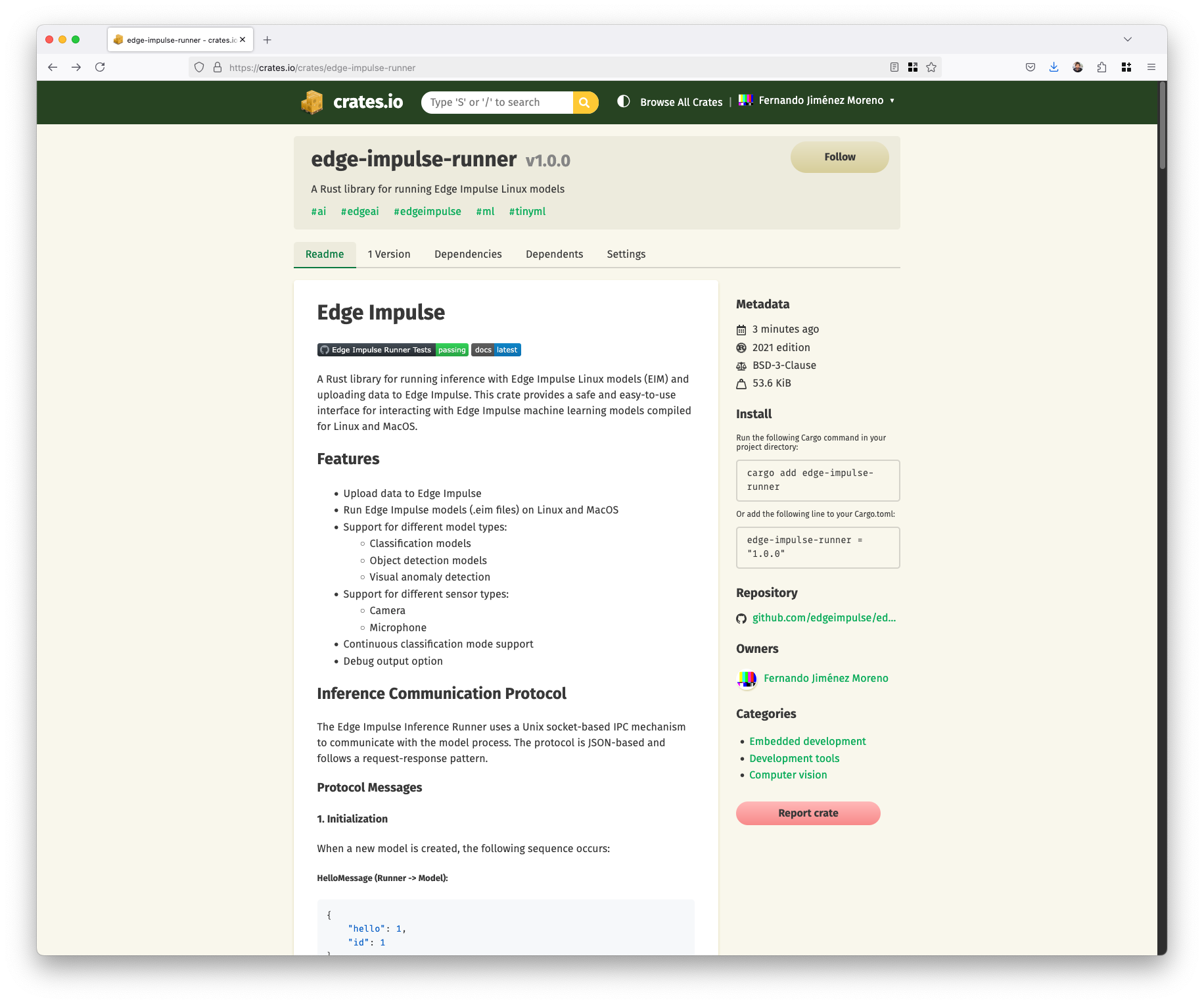 The library is published on crates.io under the name edge-impulse-runner.