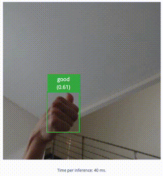 With the plan laid out, Suryo jumped into the nuts and bolts of bringing the project to life. He decided on a set of four hand gestures (“neutral” (fist), “five” (open hand), “peace” (V-sign), and “good” (thumbs up)), then collected a dataset consisting of multiple examples of each gesture via webcam. After creating a new project in Edge Impulse, he uploaded the dataset using the Data Acquisition tool. Since the goal was object detection, each gesture was identified by drawing a bounding box around it and assigning a label in the Labeling Queue tool.