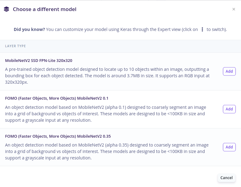 To select the FOMO model, we will head over to the ‘Object detection’ section, select ’Choose a different model’ then choose one of the FOMO models as shown in the image below.