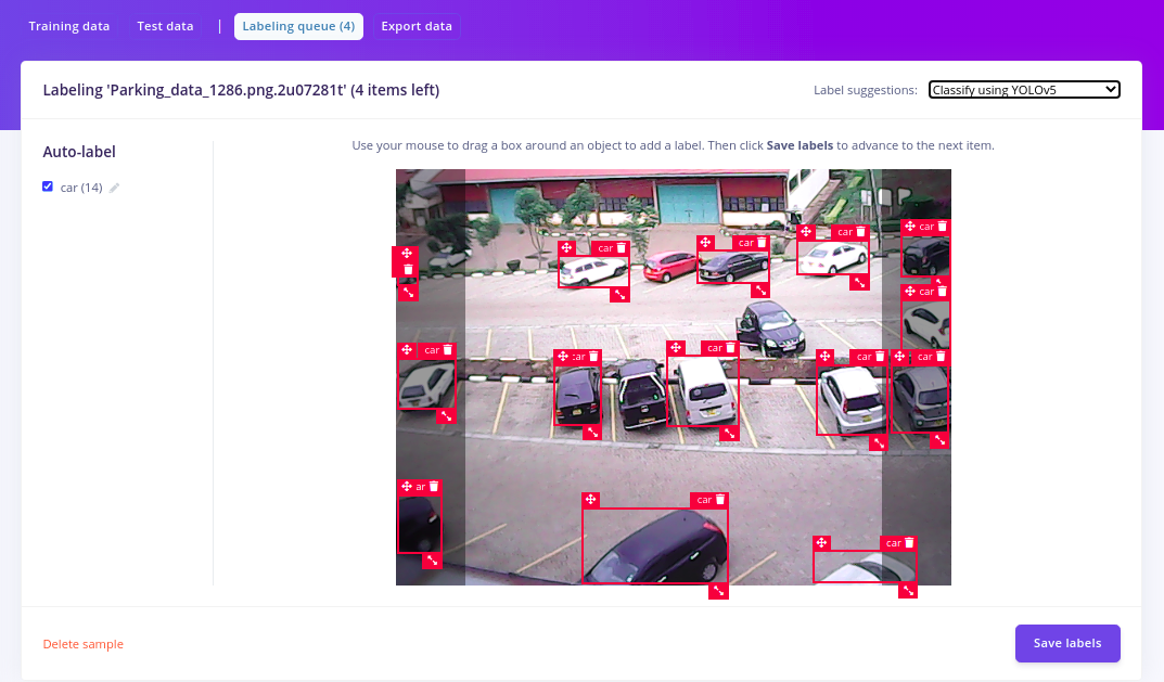 To start, we will first create a project on Edge Impulse studio, and set the labeling method to ’Bounding boxes (object detection)’. We will then collect and annotate some images of cars in a parking lot. Since the ’car’ class is already available in YOLOv5, we can readily use the pre-trained model to make our annotation work much easier and faster. This automated annotation technique can be particularly important when working with a large number of images with classes already available in the COCO dataset. To enable this feature, we will first click the Label suggestions dropdown, then select “Classify using YOLOv5.” (See 3 Ways to Do AI-Assisted Labeling for Object Detection for more information).