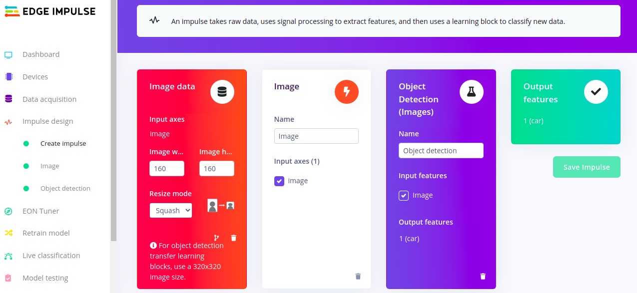 With our dataset now fully annotated, we can now go ahead with creating and training our car detection model with FOMO. We will first set our image size to ‘160*160’ under the ‘create impulse’ section then select ‘grayscale’ under the image section. You should however note that the input image size is fully flexible and configurable depending on your target deployment device. If you are working with a resource-constrained MCU, you might want to use a lower image resolution like ‘96*96.’