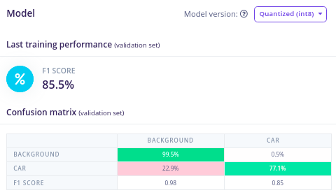 Using Mean Average Precision (mAP) as the sole evaluation metric can sometimes give limited insights about a model’s performance. This is particularly true when dealing with datasets with imbalanced classes as it only measures how accurate the predictions are without putting into account the individual performance of each class. To tackle this, FOMO uses F1-Score and a confusion matrix to evaluate object detection models. F1 measures the balance between precision and recall and the confusion matrix gives an insight of how good or bad the model is for each class.