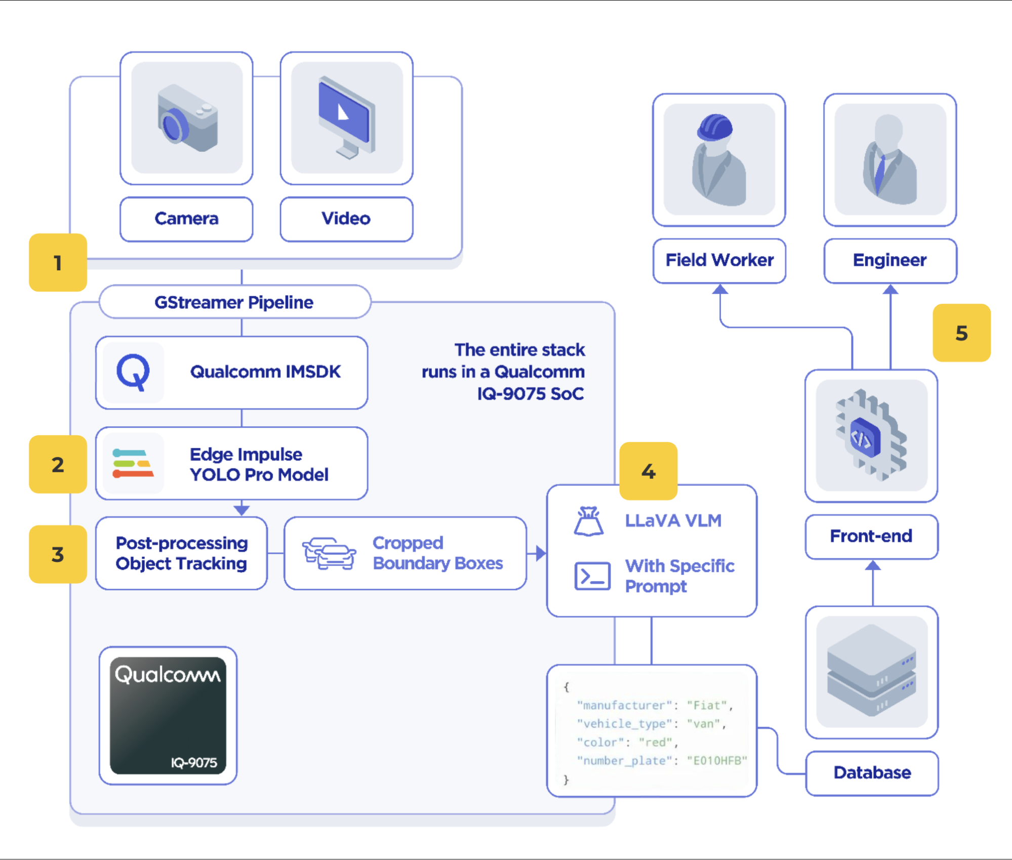 The aim for this demo was to showcase what can be done with the powerful upcoming Dragonwing IQ9 EVK through model cascading, where multiple models are used in sequence to create a powerful overall system. The use-case here was for parking lot management, showing how edge AI could be used to provide vehicle tracking and metadata collection. Here is an architecture diagram of the technologies used: