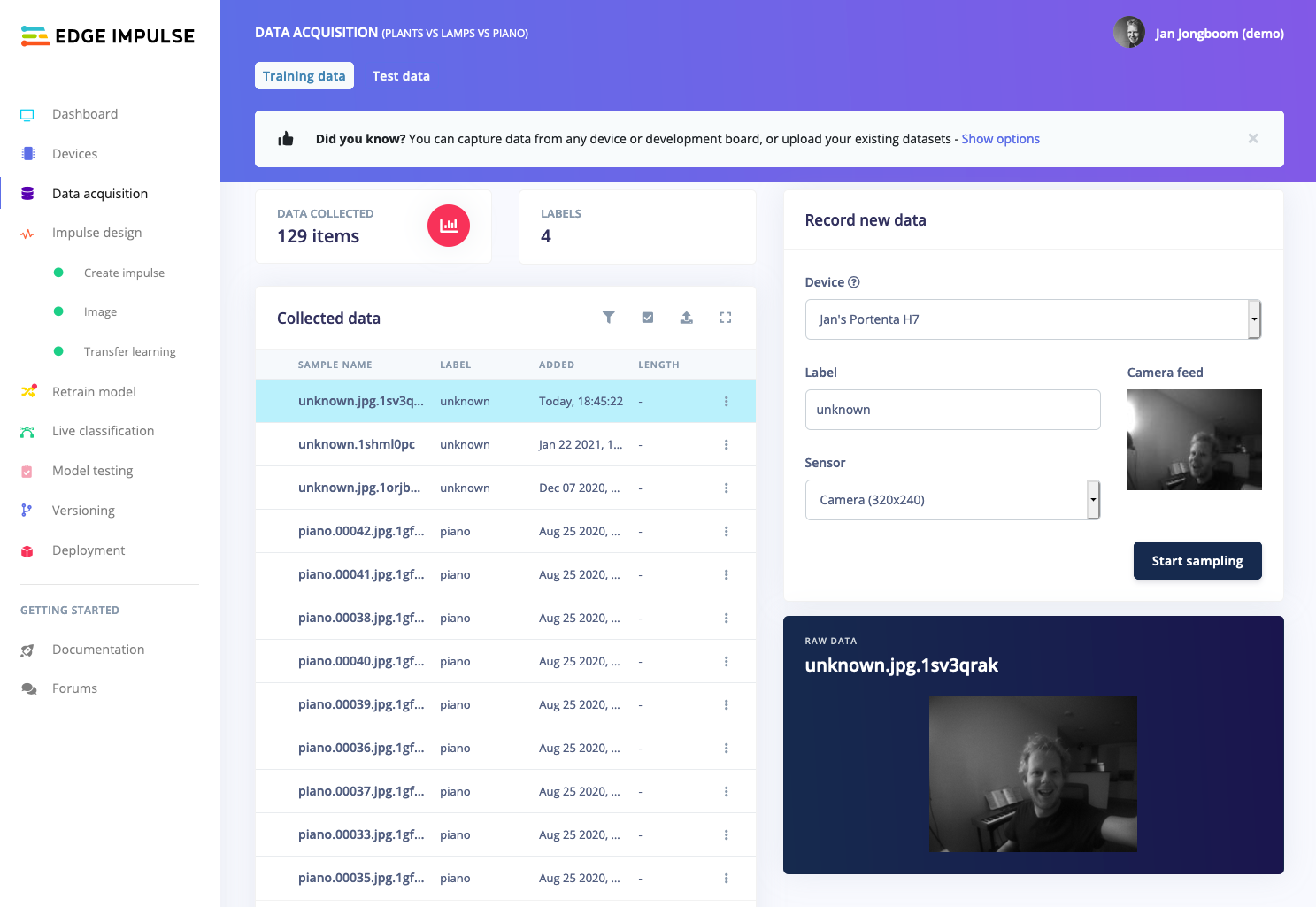 For humans, sight is one of our most valued senses. But despite the importance of vision virtually all embedded devices are still blind, having to rely on other sensors to recognize events that might be easily perceived visually. To change that, we’re partnering with Arduino to add support for Edge Impulse to the Portenta H7 and its vision shield. This allows any embedded developer to collect image data from the field, quickly build classifiers to interpret the world and deploy models back to production-ready hardware.