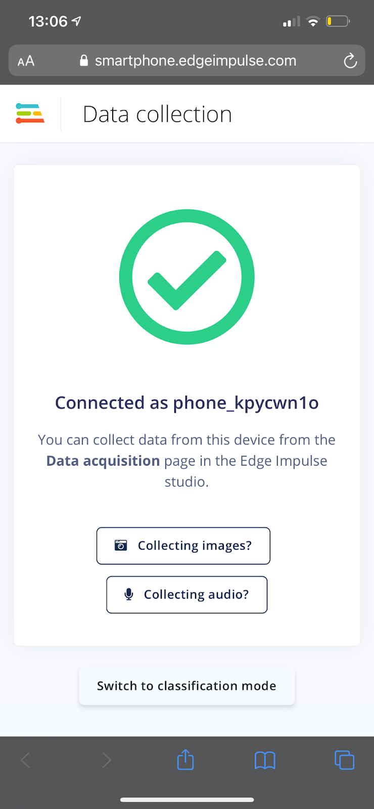 On the bottom of the page on your phone, click on the Switch to classification mode button to start downloading and building your proof of concept continuous audio classifier application using the Edge Impulse SDK directly on the web. When the project is finished building, click Give access to the microphone to allow the web browser to use your phone’s microphone: