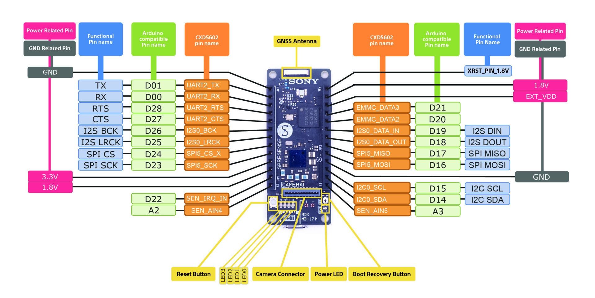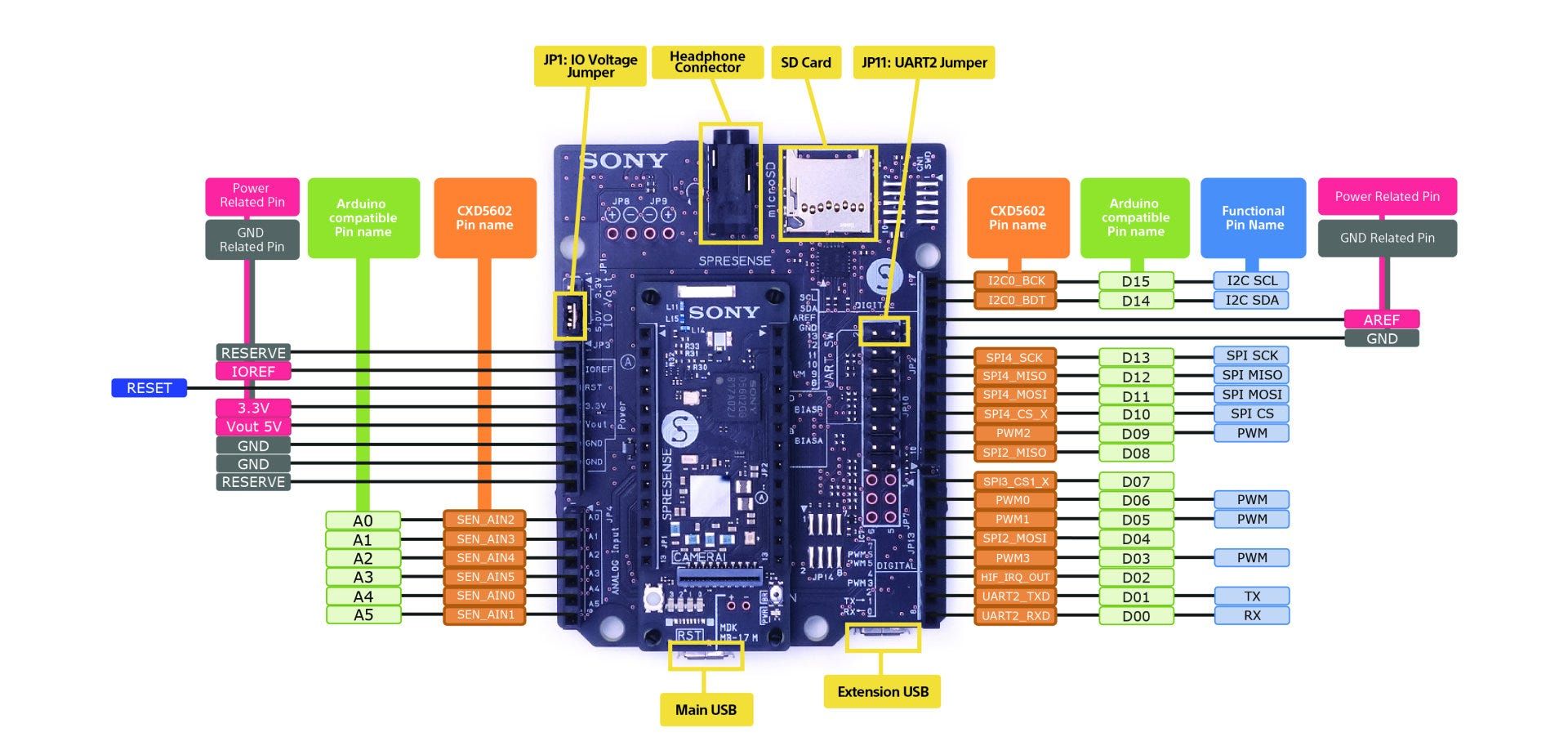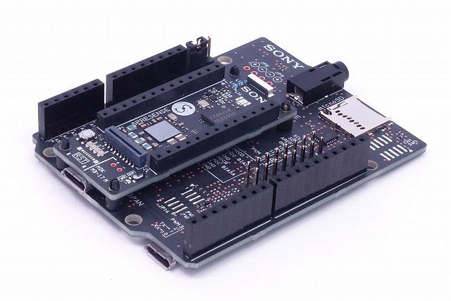 Extension board: The Spresense extension (CXD5602PWBEXT1) breakout board has the familiar Arduino Uno pinout and header arrangement for mounting Arduino shields, the pins also map directly to the equivalent Arduino pin names when developing using the Arduino IDE. The extension board itself includes a microSD card socket, which is required for storing captured data such as samples and image frames that are the typical in ML applications.