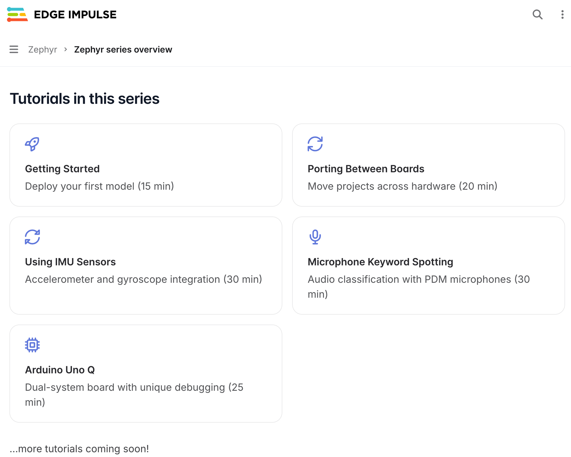 To help you maximize your Edge Impulse + Zephyr experience, we’ve launched a Zephyr series in our documentation. This series advances from simple deployments to application-level implementations, covering how to: