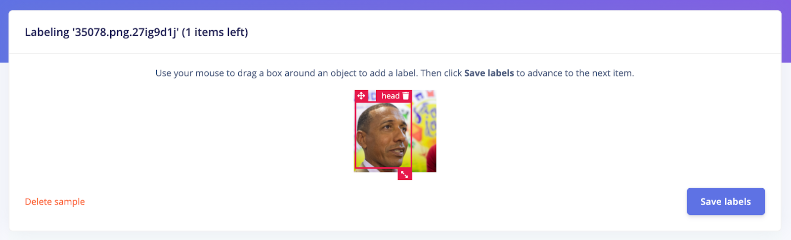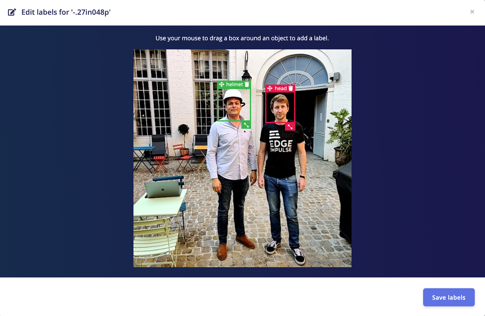 Several techniques exist to rebalance a dataset, here, we will add new images from Flickr-Faces-HQ (FFHQ). These images do not have bounding boxes but drawing them can be done easily in the Edge Impulse Studio. You can directly import them using the uploader portal. Once your data has been uploaded, just draw boxes around the heads and give it a label as below: