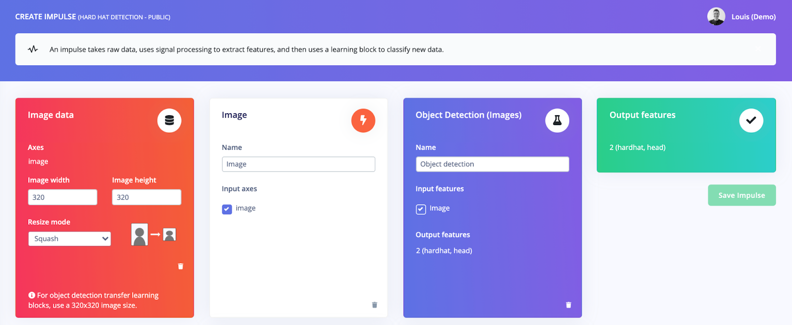 Now that the dataset is more balanced, with both images and bounding boxes of hard hats and heads, we can create an impulse, which is a mix of digital signal processing (DSP) blocks and training blocks: