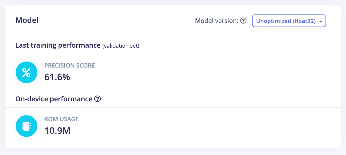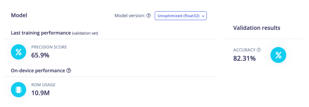 To train the model, we selected the Object Detection training block, which fine tunes a pre-trained object detection model on your data. It gives a good performance even with relatively small image datasets. This object detection learning block relies on MobileNetV2 SSD FPN-Lite 320x320.