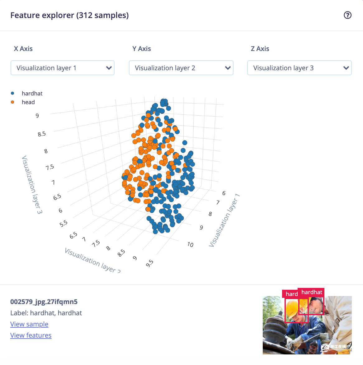 In this particular object detection use case, the DSP block will resize an image to fit the 320x320 pixels needed for the training block and extract meaningful features for the neural network. Although the extracted features don’t show a clear separation between the classes, we can start distinguishing some clusters: