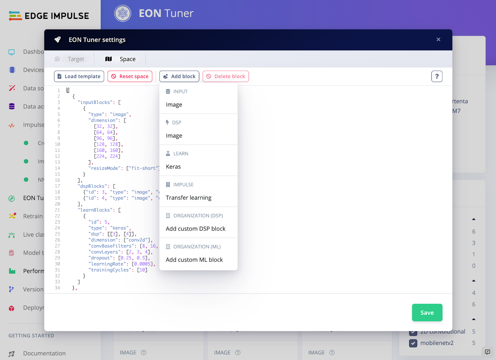This is why we just released an extension of the EON Tuner today, the Search Space. Along with the Search Space, we also added custom DSP and learning blocks support for our enterprise customers.