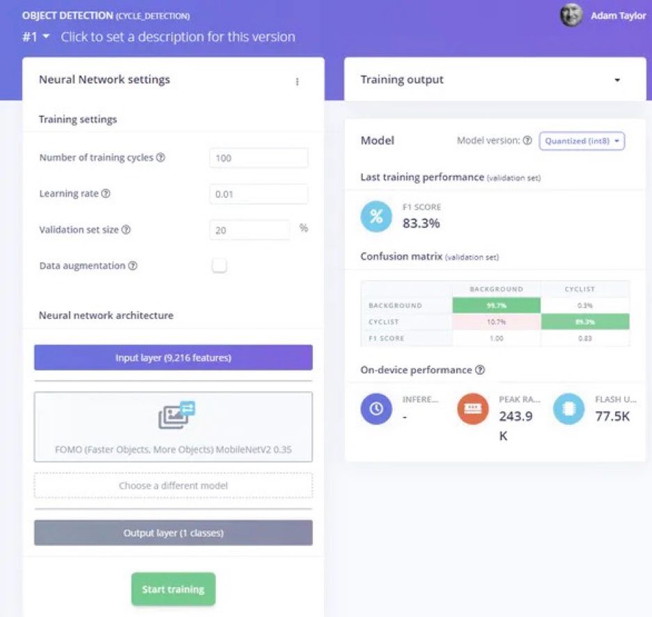 The images were uploaded to Edge Impulse, then the labeling queue was used to help draw bounding boxes around the cyclists in each image. The remainder of the impulse was rounded out with an image processing step followed by a FOMO object detection neural network. The first round of training did not produce a good result, so Taylor made a few changes to the impulse. He set the image preprocessing step to resize the images, and also adjusted some of the model hyperparameters and increased the number of training cycles. After this, a round of training resulted in a very nice 81.82% accuracy rate. Now the model was ready to be deployed and tested out on the physical hardware.
