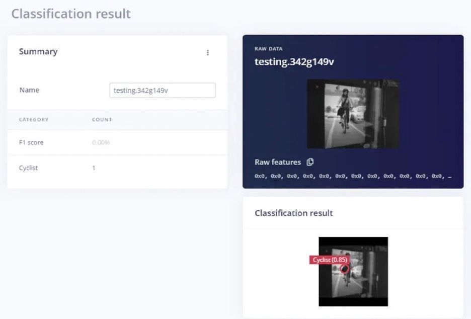 The Himax WE-I Plus is fully supported by Edge Impulse, so the deployment process can generate a native binary to flash the board with. After updating the firmware, the Live Classification tool in Edge Impulse allowed Taylor to view the images captured by the Himax WE-I Plus’s camera in real time, along with any objects that are detected. He ran a number of tests, and found that the device was successfully detecting cyclists, as was hoped.
