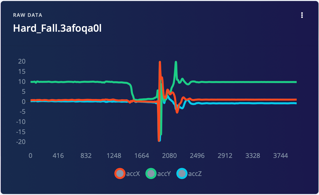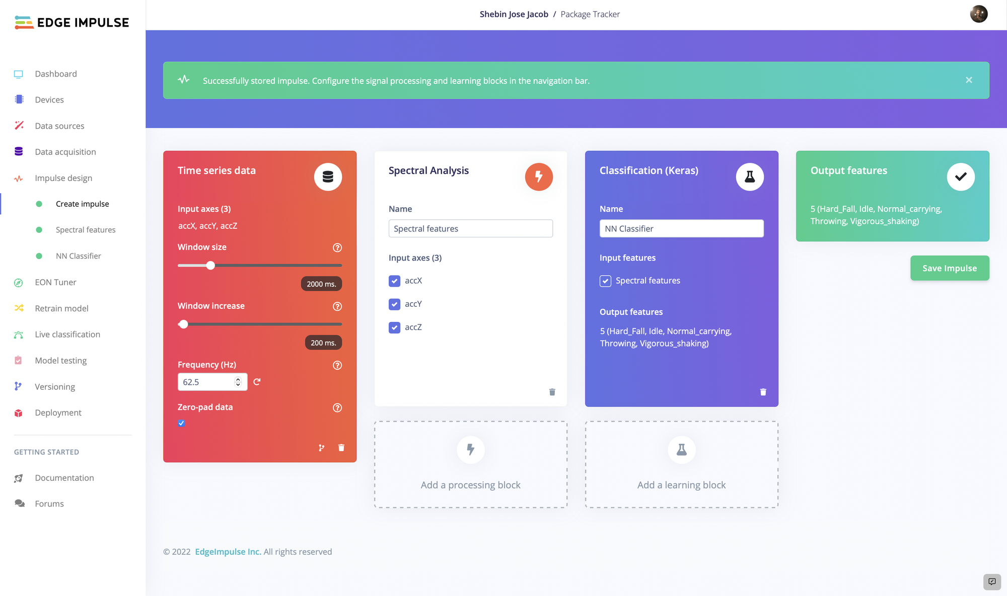 A batch of example data would be needed to teach the model the conditions that it should recognize, so Jacob assembled the device and started collecting IMU measurements. Initially he wanted to be able to recognize five conditions — hard fall, vigorous shaking, throwing, normal carrying, and idle. Through a simple process, the Arduino was connected to his project in Edge Impulse Studio, after which any collected data was automatically uploaded to the project. After shaking, throwing, and generally abusing the package for 28 minutes to collect data, Jacob was ready to move on to the next step — creating an impulse.