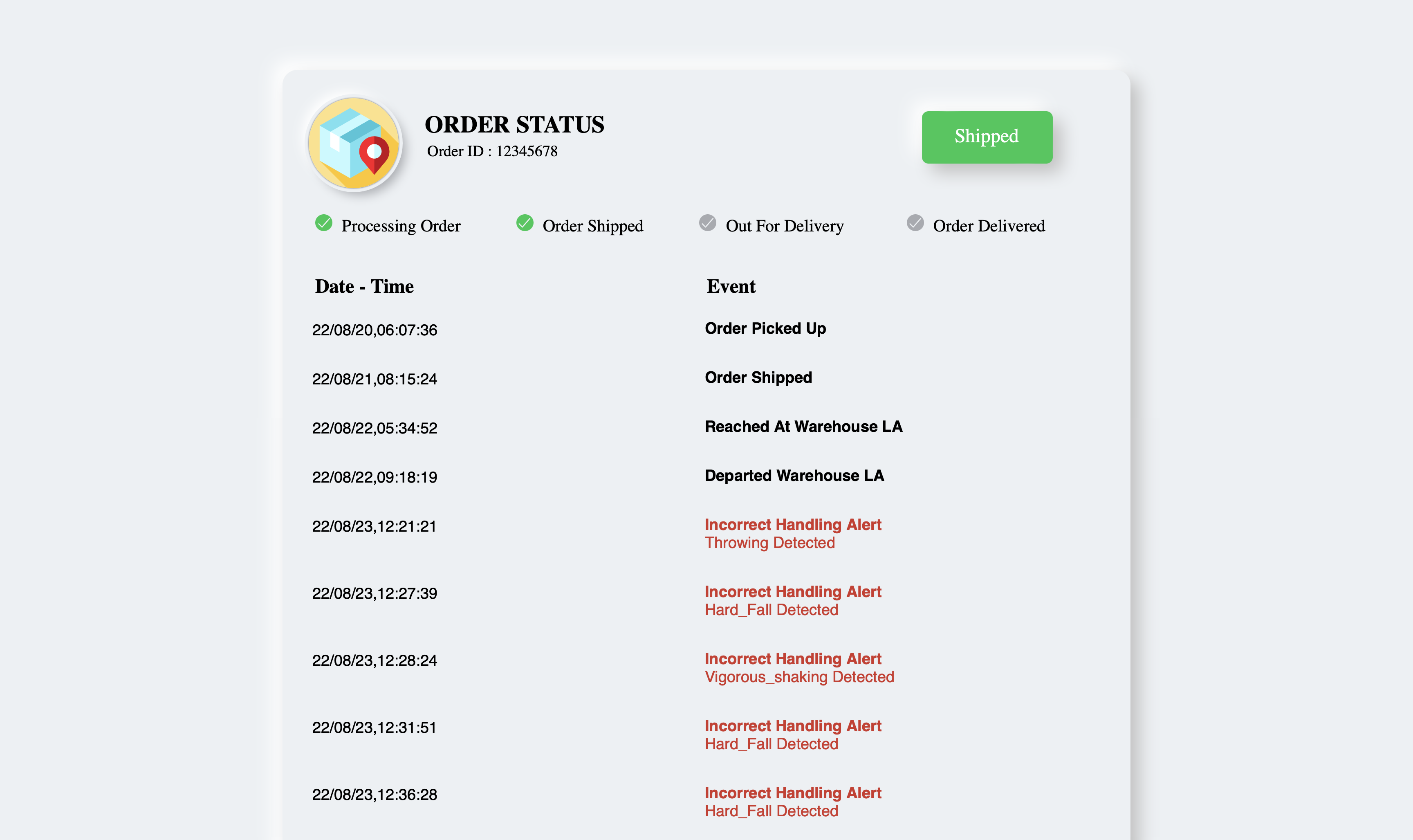 When a package equipped with Jacob’s device detects either a hard fall, vigorous shaking, or throwing, a record is inserted into a cloud database. That information can be incorporated into the normal tracking information, and it can also be used in the event of a problem to determine where damage was most likely to have occurred. In this way, finger pointing can be replaced with hard facts, and issues can be resolved more quickly.