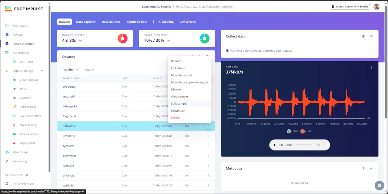 To collect this data, Sankhla first flashed the ESP32-S3 microcontroller with firmware that continuously captures audio from the microphone and transfers it to a computer via USB. Sankhla wrote a Python script on the computer that leverages the Edge Impulse API to upload the audio to an Edge Impulse project. With that in place, existing audio samples were played within range of the microphone.
