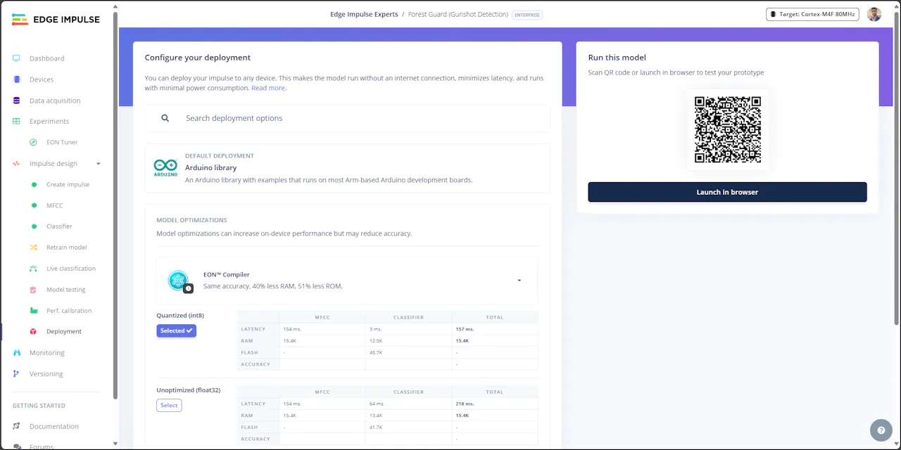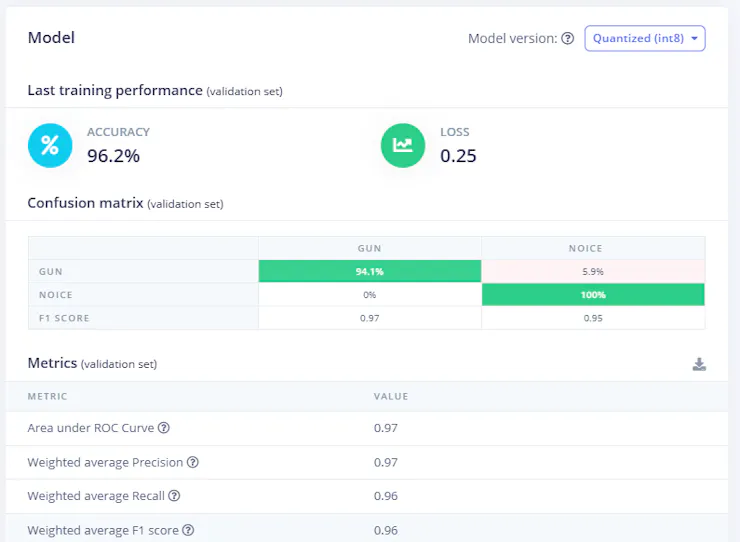 These audio fingerprints were then fed into a neural network classification block. During training, the model learned to distinguish the unique spectral signature of a gunshot from general environmental noise. The results were impressive: the trained model achieved better than 96% accuracy in distinguishing gunshots from background noise. Edge Impulse optimized the model heavily, resulting in an impulse with a tiny footprint that requires only about 12.5 KB of RAM and takes just 3 milliseconds to run an inference on the ESP32-S3.