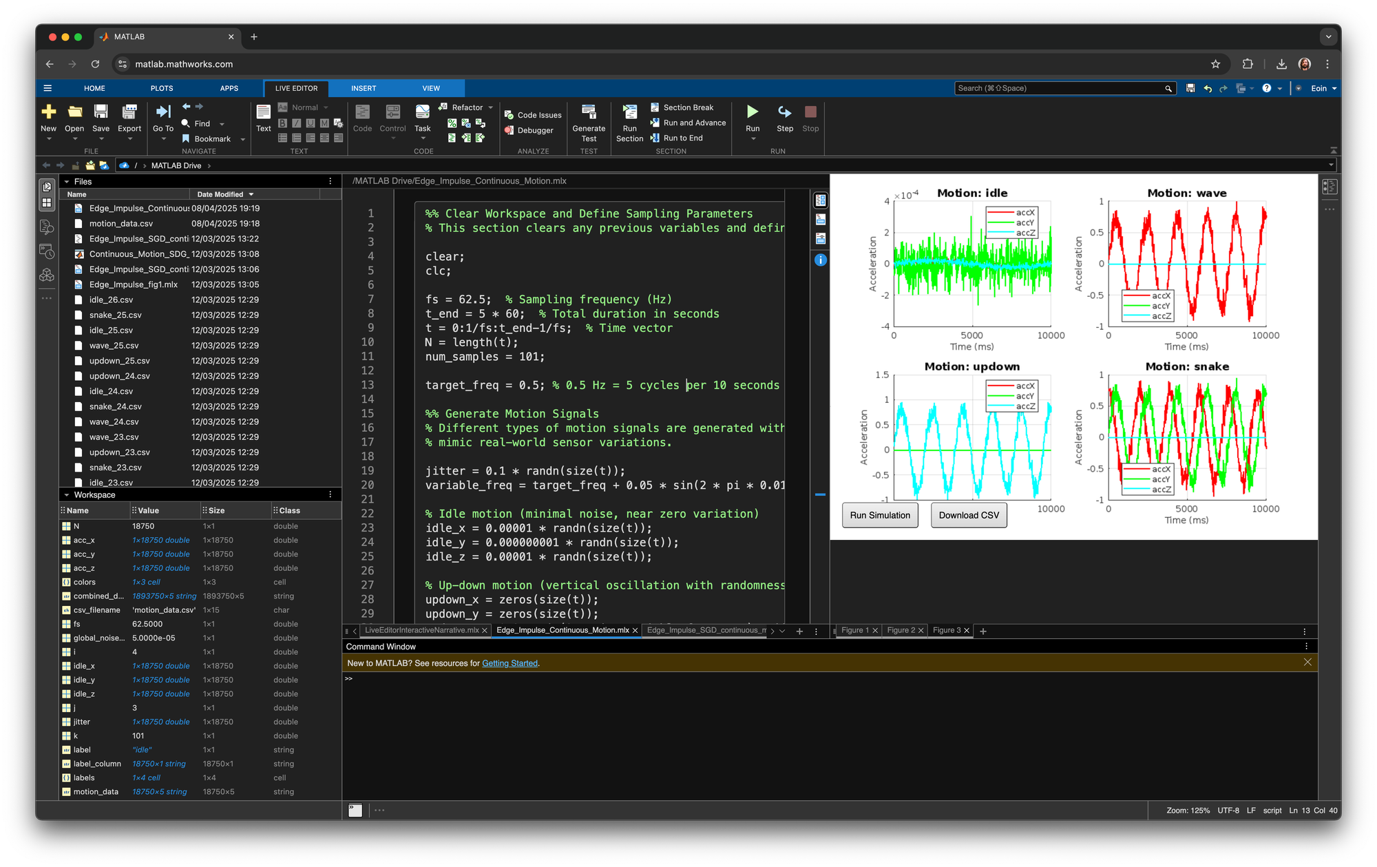 Consider one of our common projects “continuous motion,” which uses multiple motion classes, such as “idle,” “snake,” and “up-down” patterns. To recreate this in MATLAB to go from 8 mins of manually collected data to 8 hours, we need to start by: